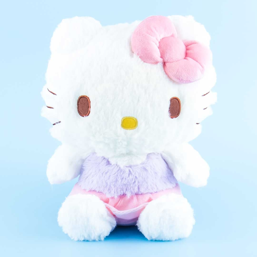 A super-soft Hello Kitty character plushie from the Sanrio Hug Hug Series wearing a pastel outfit