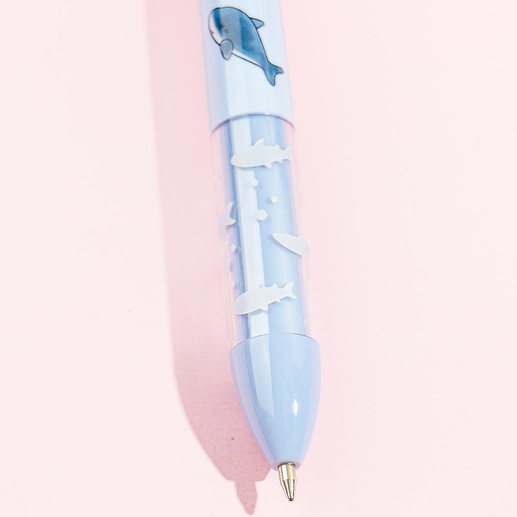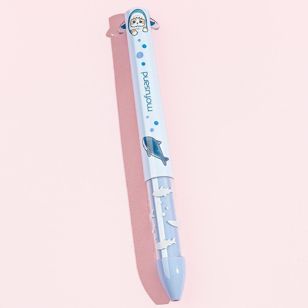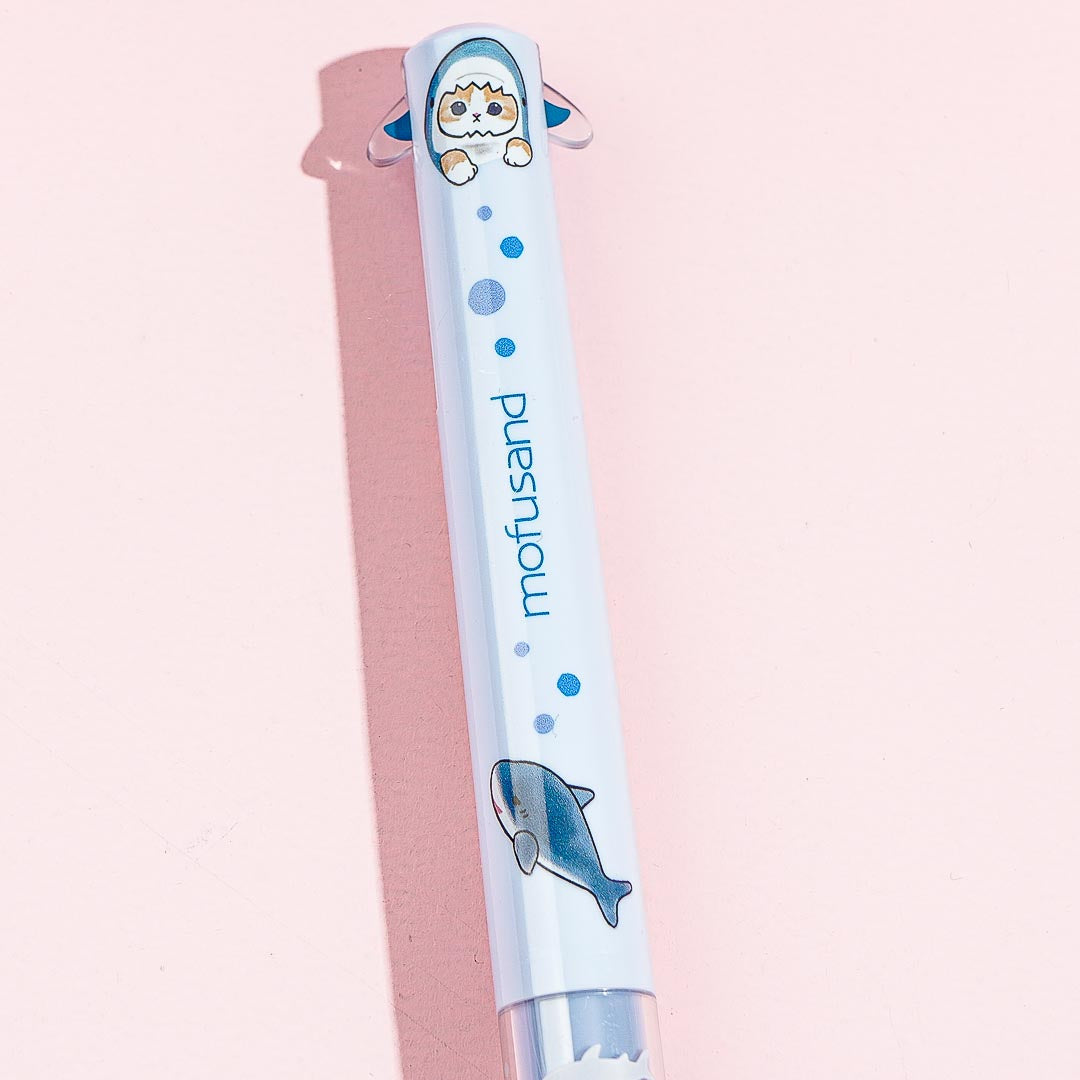 Use this two-color click pen to write cute diary entries. It features prints of a Mofusand cat dressed wearing a shark onesie as well as prints of sharks in the sea. This pen has cute ear decors for the click buttons!