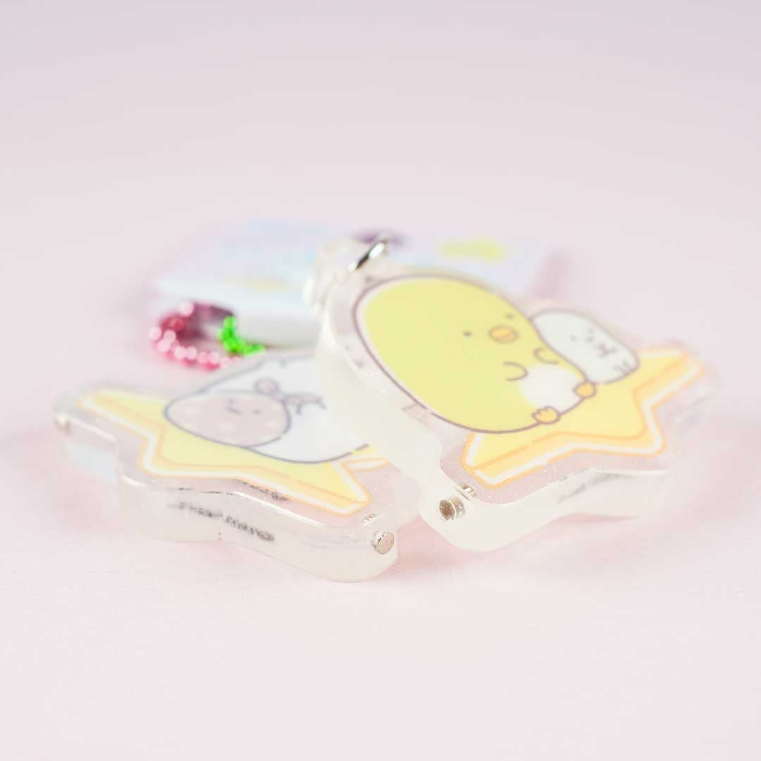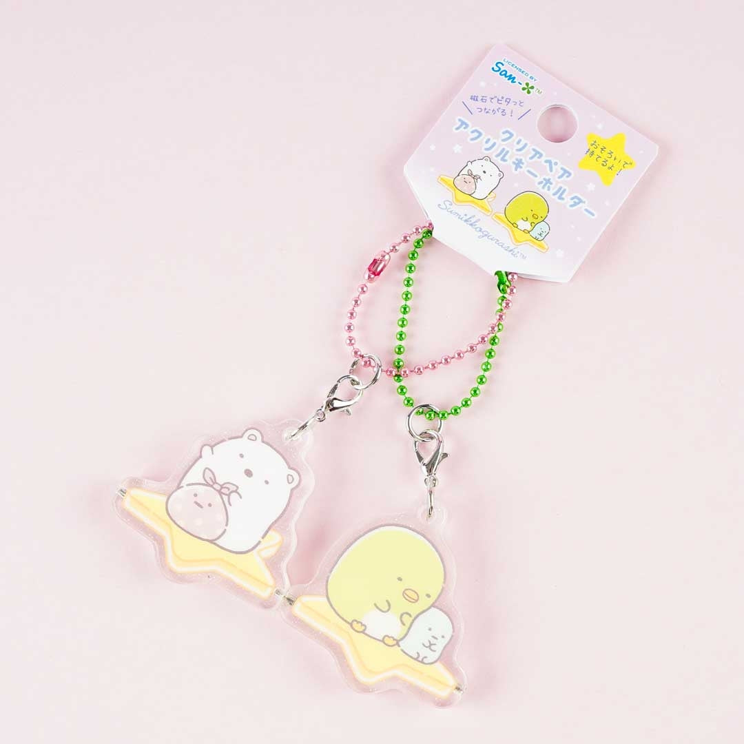 Have fun collecting these cute charms with glittery details. Each kawaii piece has magnets on both sides and they stick together when they get close. One charm features Shirokuma while it displays Penguin? on the other. Both have colorful ball chains with metal hooks.