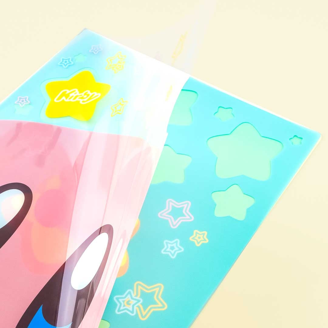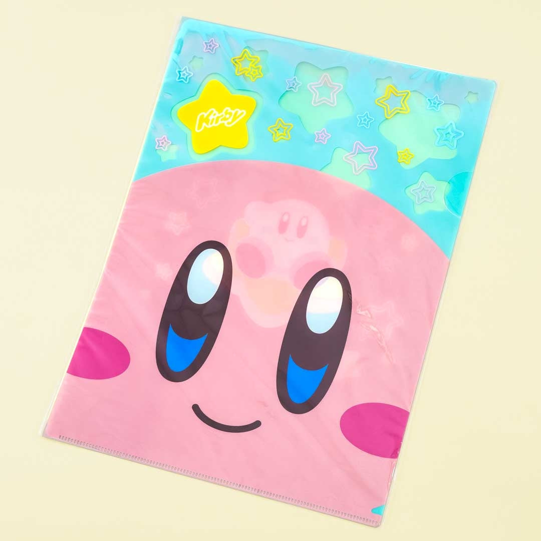 • A kawaii semi-transparent file folder with a close-up print of Kirby’s face