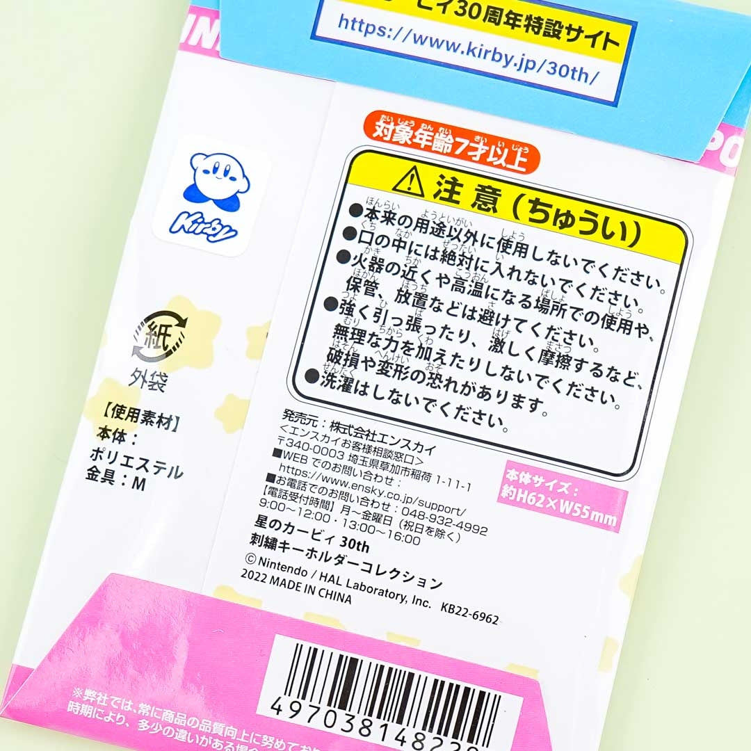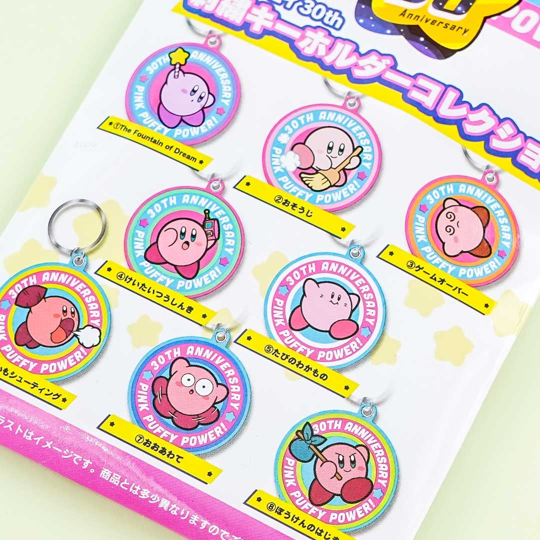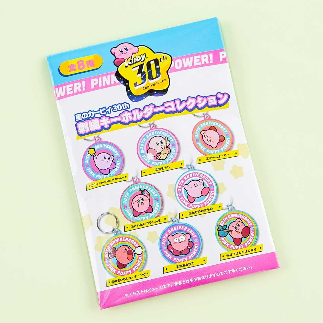 Keep your different keys organized by using this special collection of keychains! The set includes eight pieces that feature different Kirby embroidery designs! This collection was created in celebration of Kirby’s thirtieth anniversary. You’ll receive an eight-piece set with random embroidery out of thirty possible designs when you order.