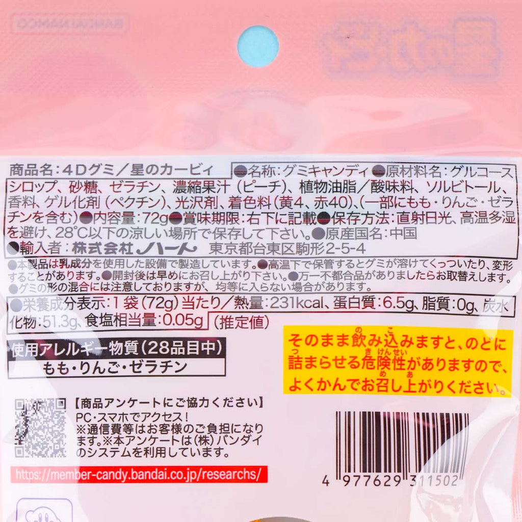 Share this pack of yummy peach-flavored gummies with your friends! It's illustrated with Kirby. Inside the pack are gummies shaped like Kirby and gummies shaped like stars. Have fun placing Kirby on the stars and playing around with the gummies!