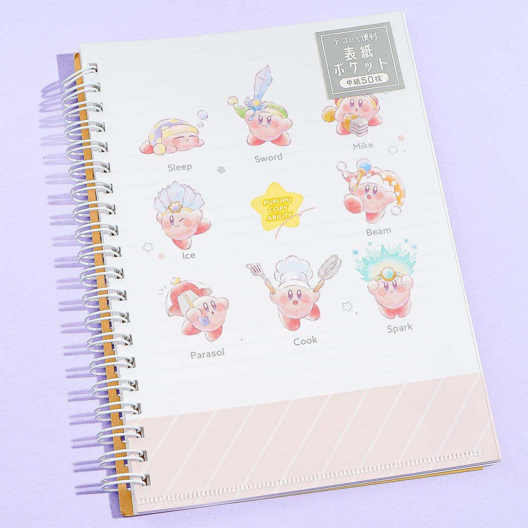 Practice your cursive handwriting and calligraphy using the lined pages of this kawaii spiral notebook! Its cover is decorated with super cute prints of Kirby’s famous “copy ability” game move.
