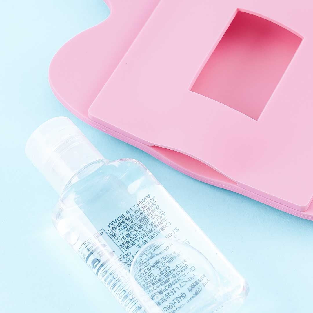 A bottle of alcohol handgel with a kawaii Kirby carrying case