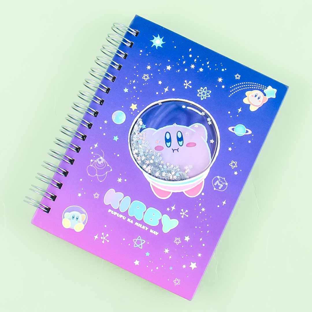 Write stories on the lined pages of this super cute hardcover notebook featuring prints of Kirby playing in space! Its cover also features shakeable glitter. The pages of this kawaii notebook are accented with illustrations of Kirby and his friends!