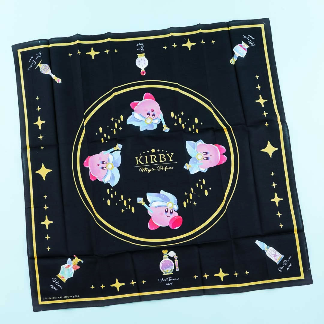 Use this kawaii handkerchief to keep your hands dry from sweat. This cotton handkerchief comes from the latest "Kirby Mystic Perfume" collection featuring prints of Kirby and special scent bottles named after his greatest foes.
