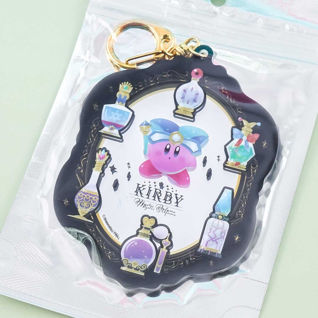 • A die-cut acrylic charm shaped like a mirror with prints of Kirby and perfume bottles