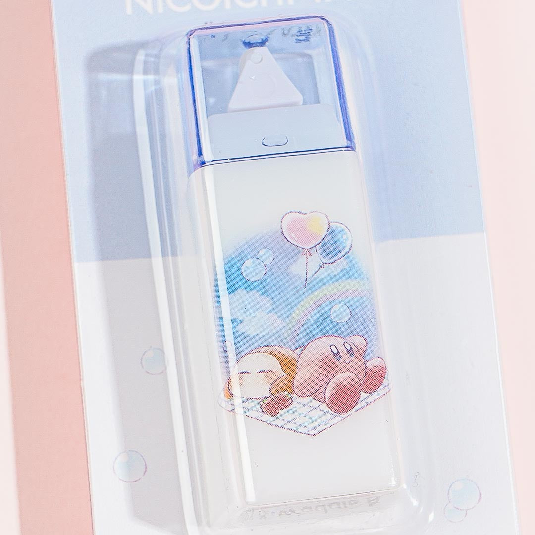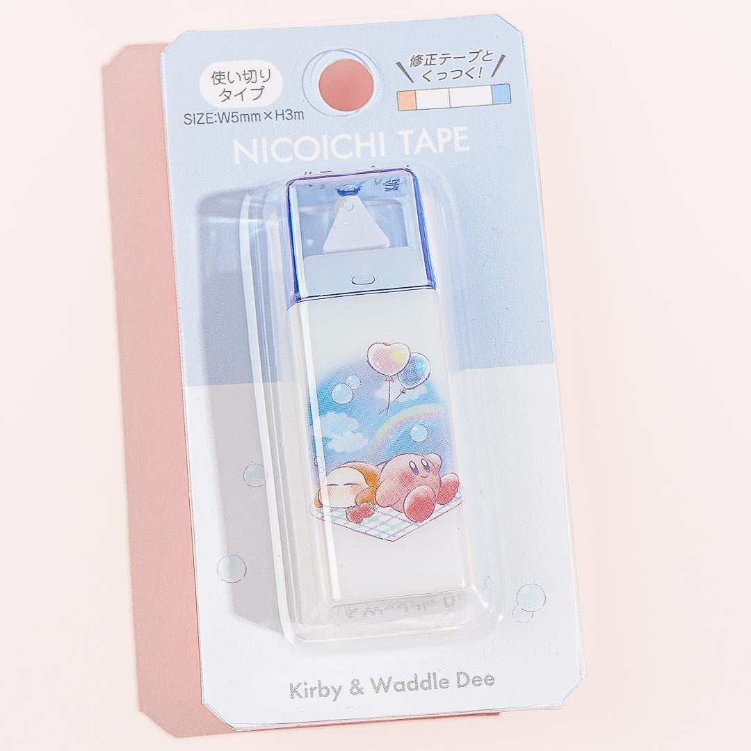 Bring this super kawaii correction tape glue in your pencil case. It features a print of Kirby hanging out with Waddle Dee! It's great for erasing mistakes from your notes.