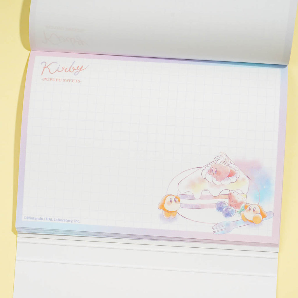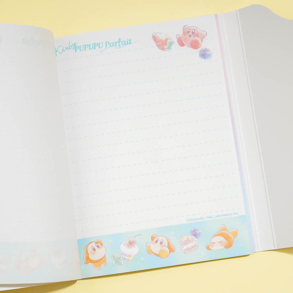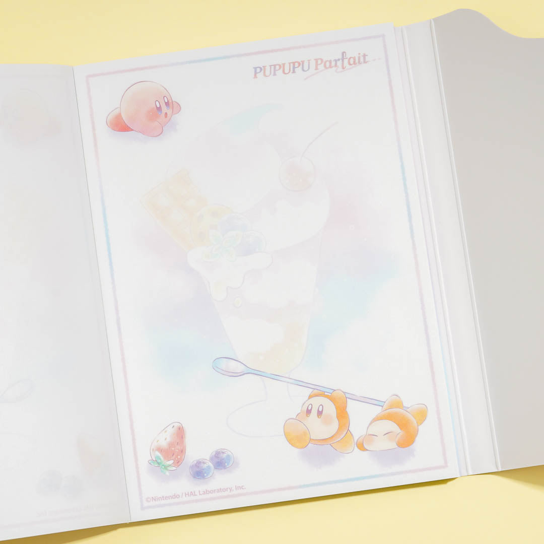 Write poems and short stories in this kawaii notepad! It features cute prints of Kirby and Waddle Dee enjoying a parfait. This A6-sized notepad also comes with a cute die-cut flip cover!