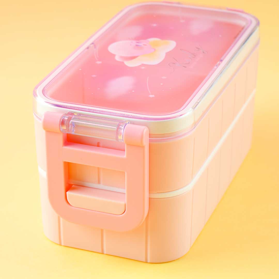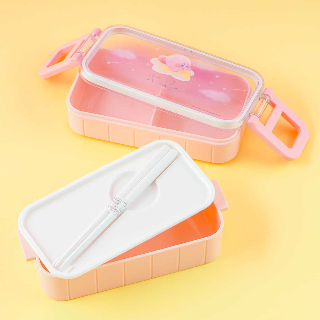Take this two-tier lunchbox to your next picnic! The main clear lid has dual side locks and is decorated with an illustration of Kirby riding a star! This kawaii set also comes with a pair of reusable chopsticks.
