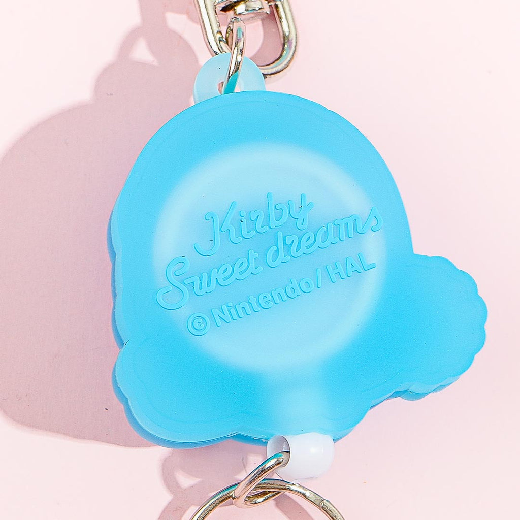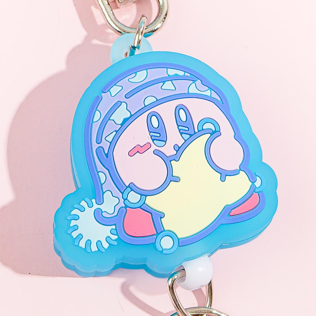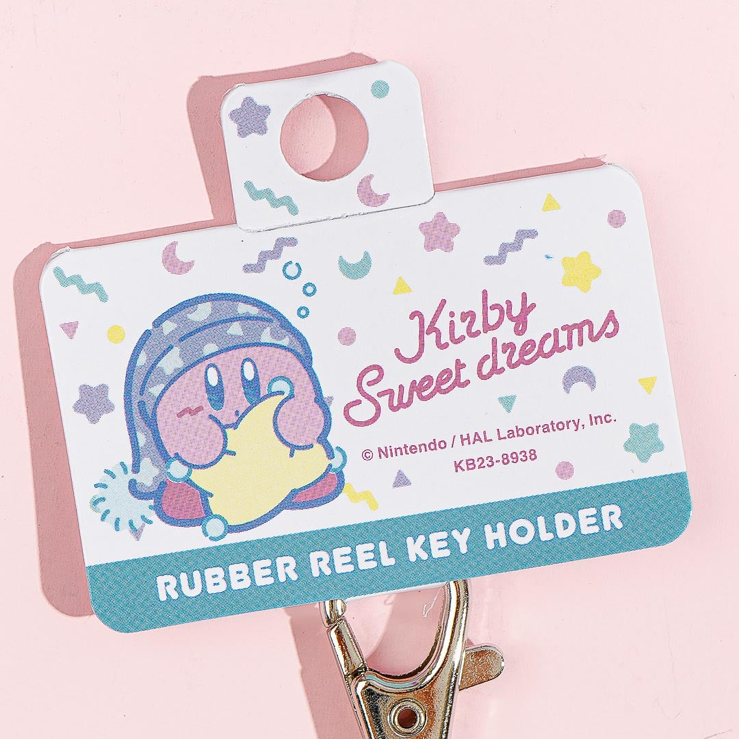This kawaii keychain features a print of Kirby getting ready to sleep. Use it to organize your keys! Its keyring has an expandable reel so you can easily reach for your keys while trying to unlock the door.