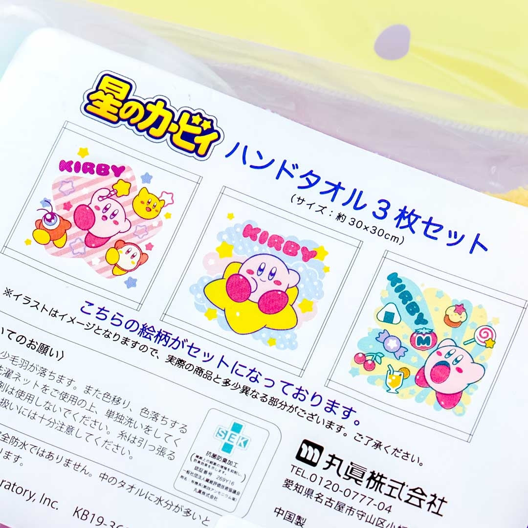 A super kawaii set of cotton towels featuring different desins of Kirby playing with stars, candy, and friends