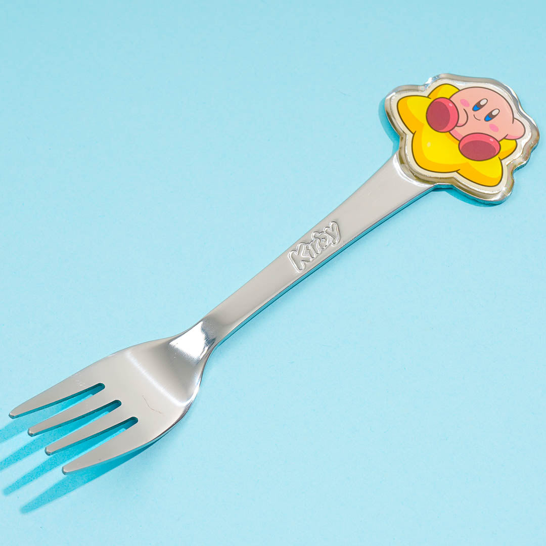 This cute stainless steel fork has a handle showcasing Kirby riding on a warp star! Use it to eat your favorite meals. You can easily clean this fork in the dishwasher.