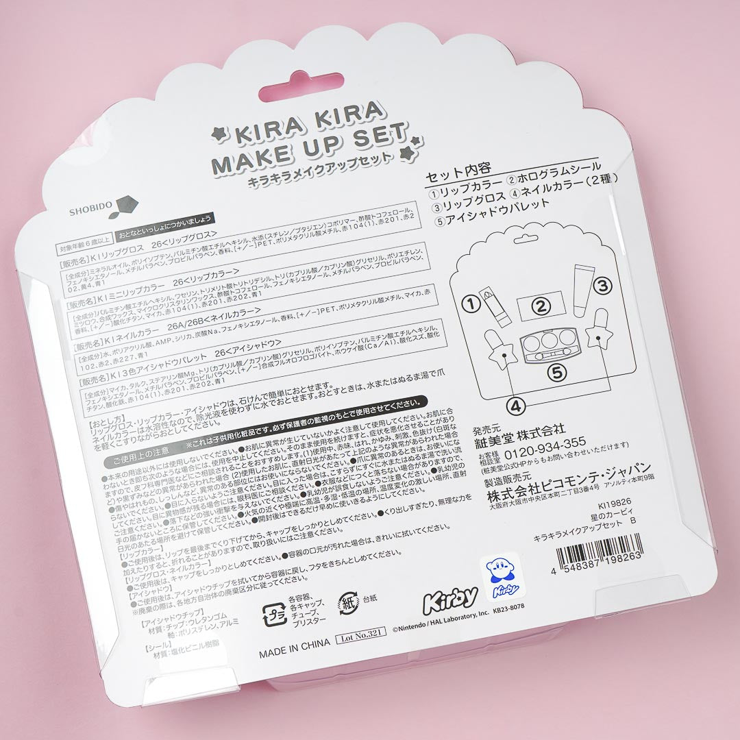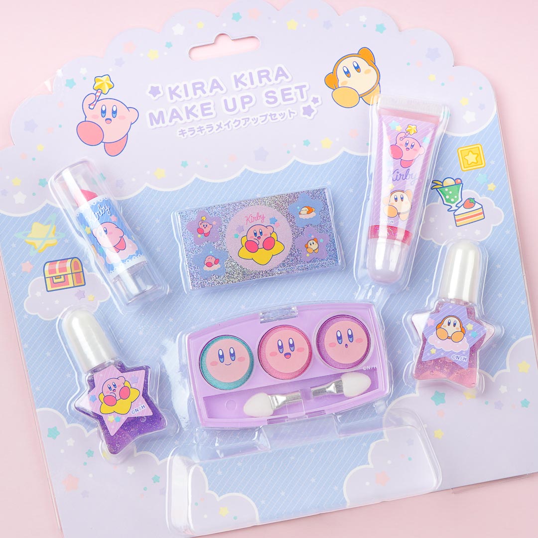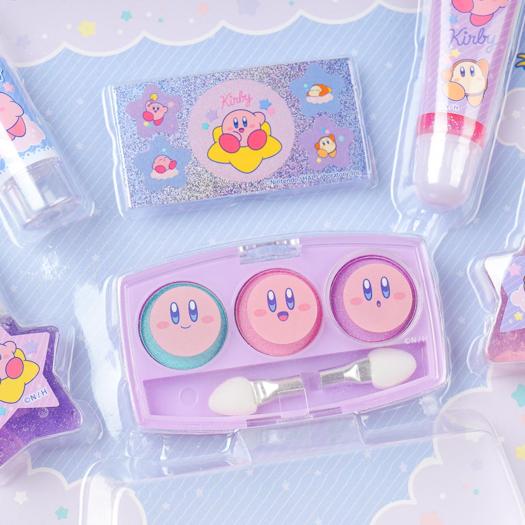 Kawaii-fy your look with this cute makeup set! It features Kirby's Dream Land illustrations on a starry background filled with desserts. The set includes pink and purple nail polish, lip balm, lip gloss, an eyeshadow palette with galaxy-inspired shades, and a holographic sticker.