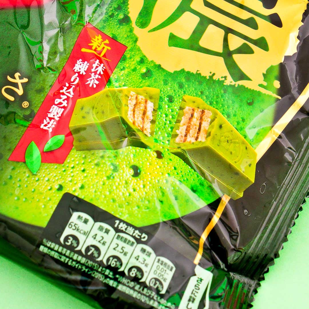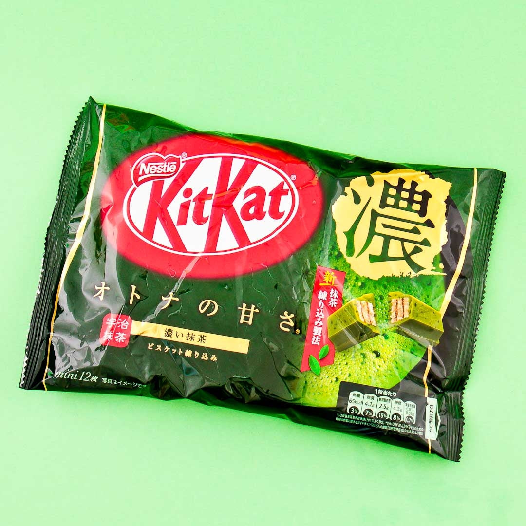 Japanese Kit Kat is famous for having new and exciting flavors for their traditional chocolate bars. With these mini Kit Kat bars you can enjoy green tea & chocolate flavours together! Matcha Green Tea Chocolate mini bars have a full, bittersweet matcha flavour. The crunchy wafer biscuit is covered with green tea dyed white chocolate, and the matcha powder is from Uji in Kyoto! A sweet first bite is followed by a refreshing after-taste of bitter tea that won't let any matcha friend down. One set includes 12 mini bars in 1 jumbo pack.