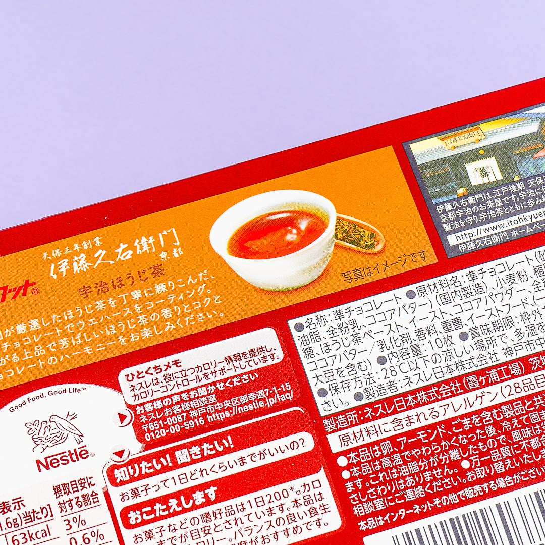 Indulge with these delicious choco-coated wafers during your break! The yummy sweet treats are inspired by the distinct almost coffee-like flavor of rich Uji matcha tea combined with roasted Hojicha from the famous Kyoto Prefecture tea shop, Ito Kyuemon.