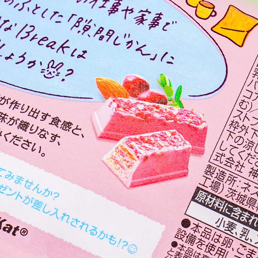 A pack of wafers coated in pink ruby chocolate topped with cranberries and almonds