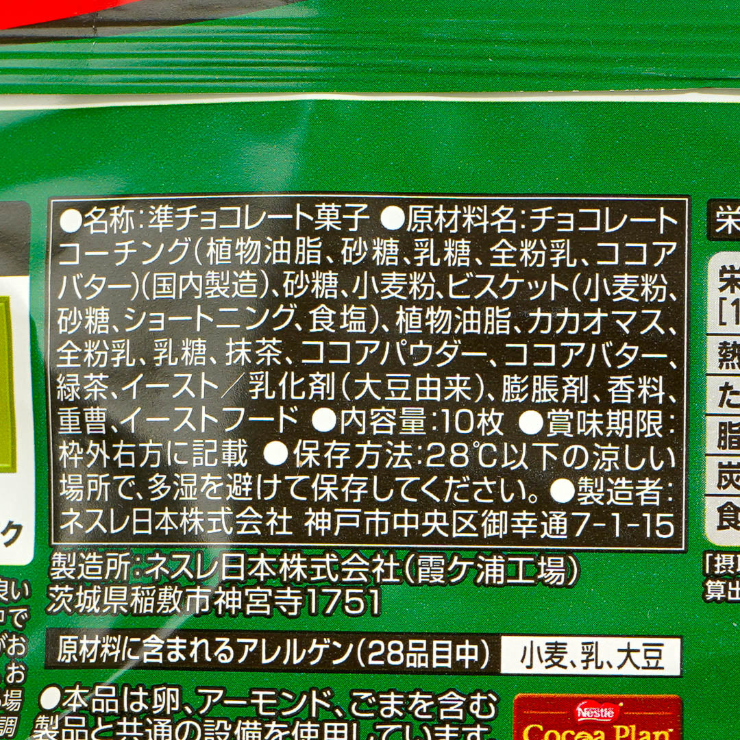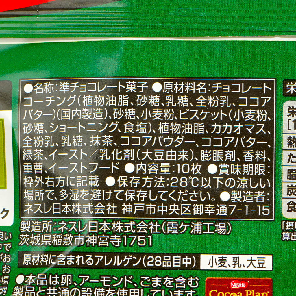 Enjoy two delicious flavors in one bite of this yummy chocolate wafer! The bottom part features the original chocolate Kit Kat flavor and the upper part is covered with strong matcha-flavored chocolate.