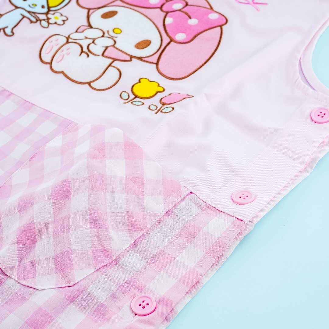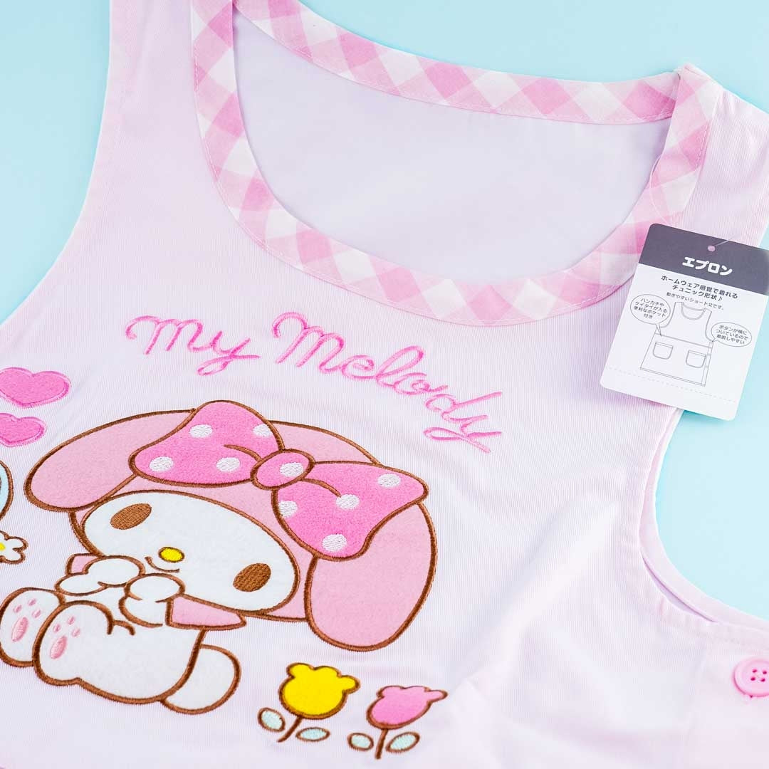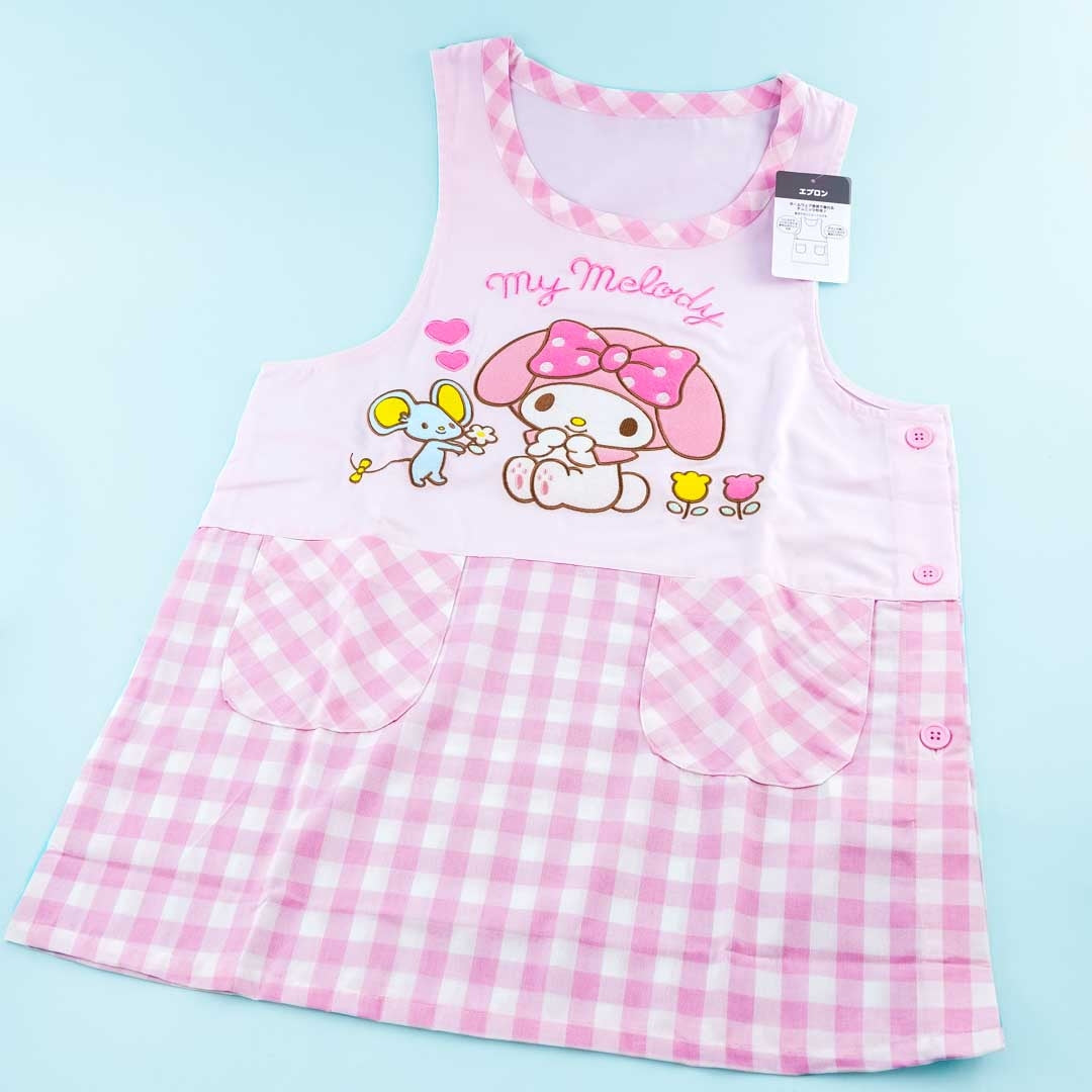 This super cute Japanese apron features embroidered prints of My Melody with her friend Flat! It features two small pockets on the front to carry your kitchen stuff. You can easily put on or take it off using its button closure on the side.