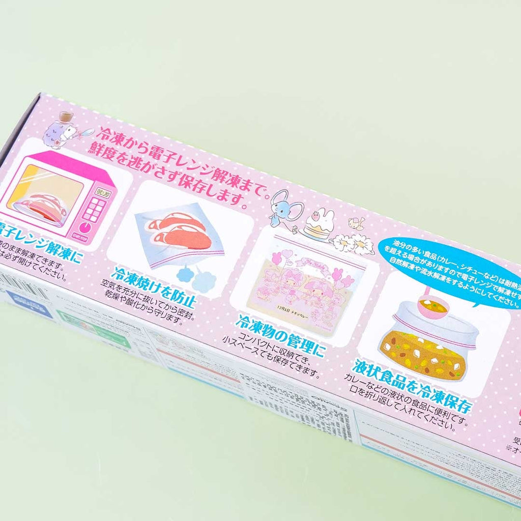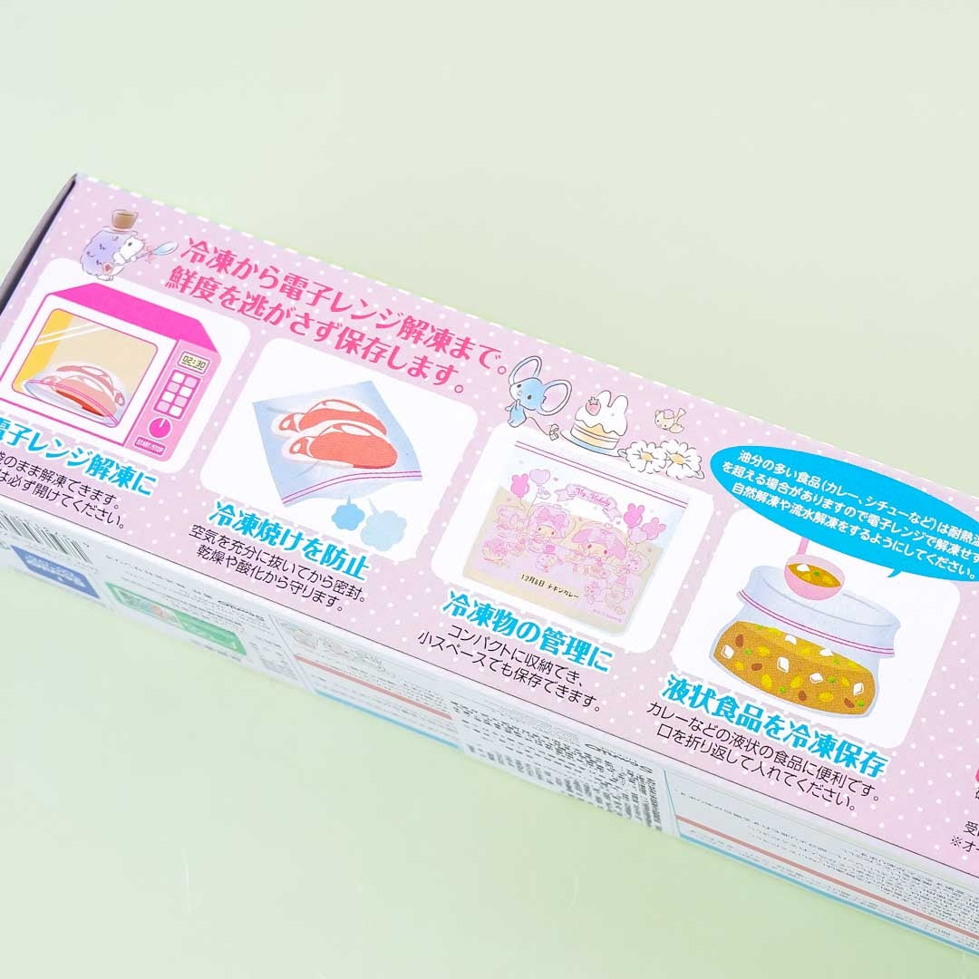 Thaw or heat food inside the microwave using these cute zip-up bags decorated with illustrations of My Melody having a tea party with friends! Make sure to open the bag up during the process. Each medium-sized plastic bag can be filled up with dried or saucy dishes. Just leave at least 20% space inside the bag so it can still close. However, it is not recommended to hold boiled food!