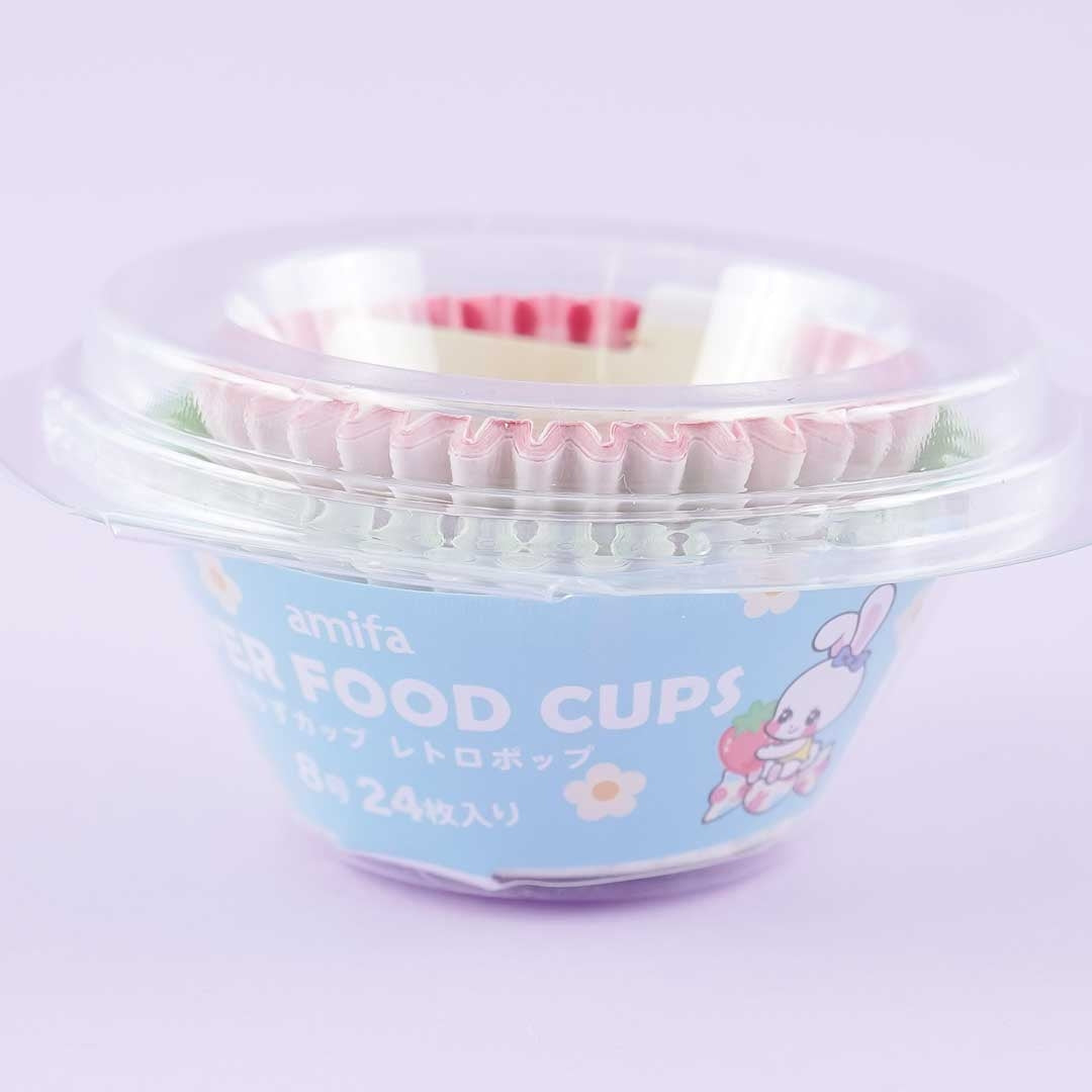 A super cute set of paper food cups showcasing retro prints of kawaii animal friends