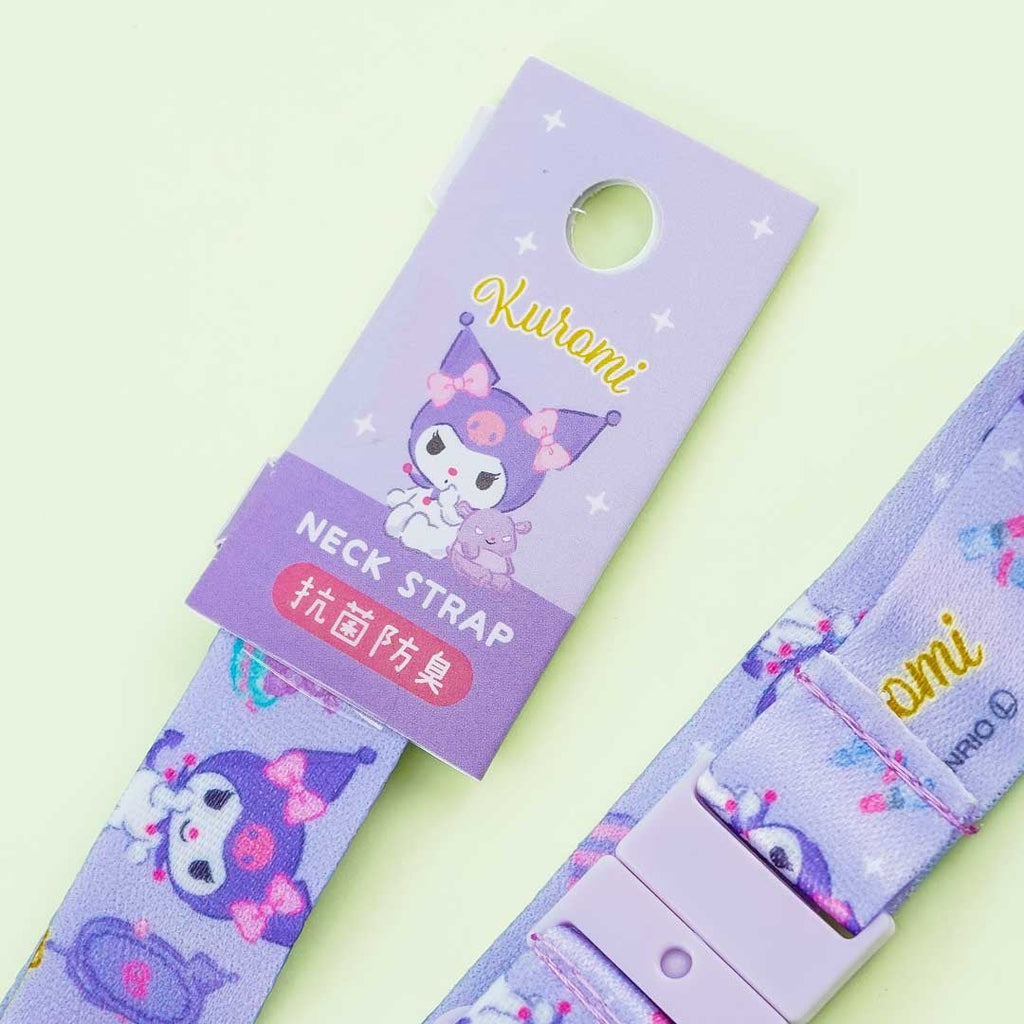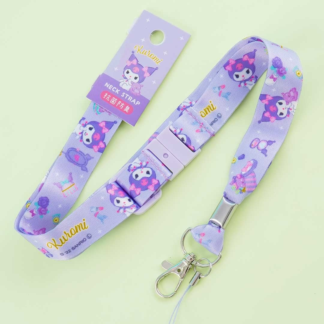 This cute lanyard is covered in prints of Kuromi having fun in her room! It has a quick-release buckle, an adjustable strap, a metal clip, and a string loop. Use it to bring your IDs or bus passes.