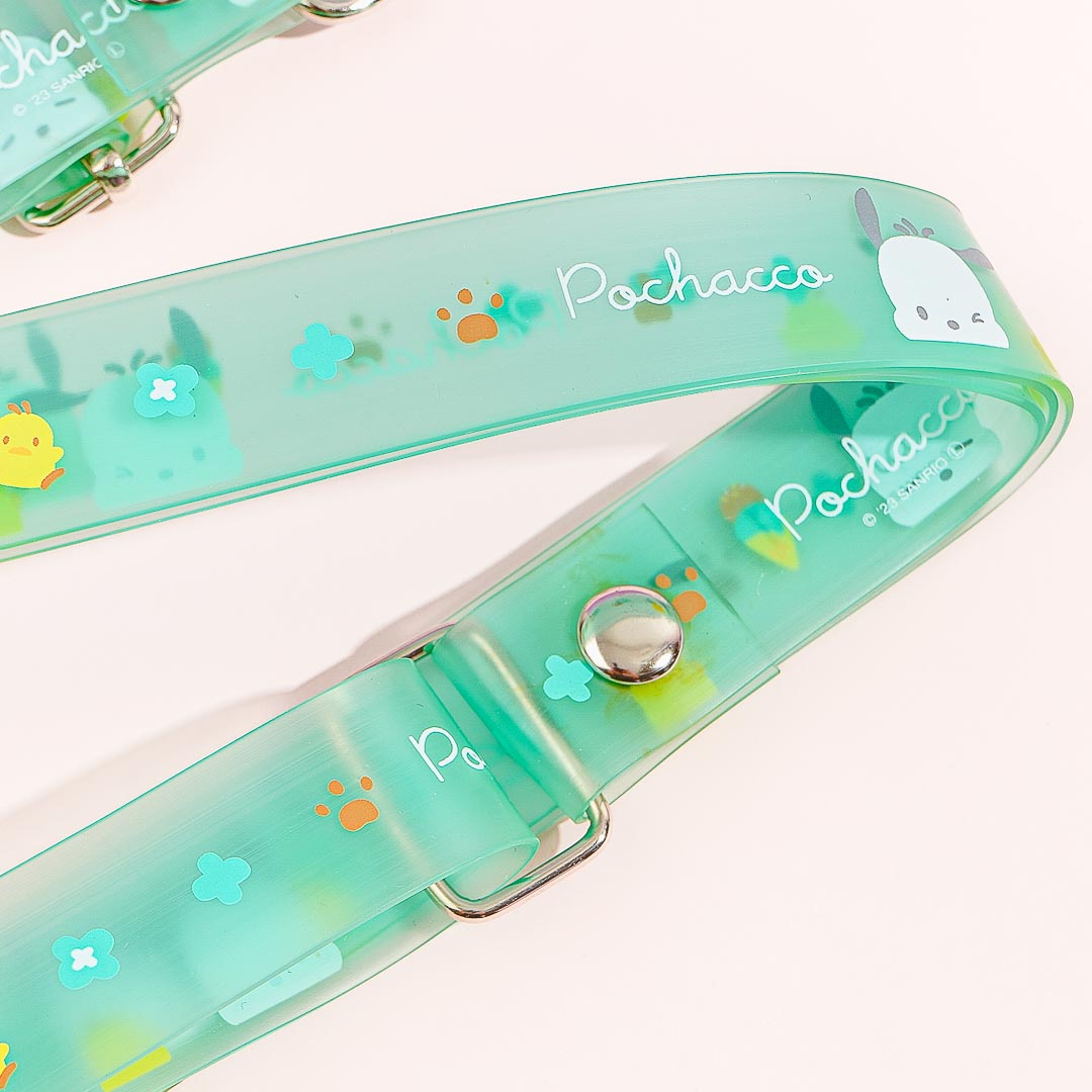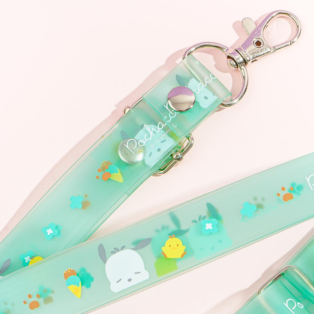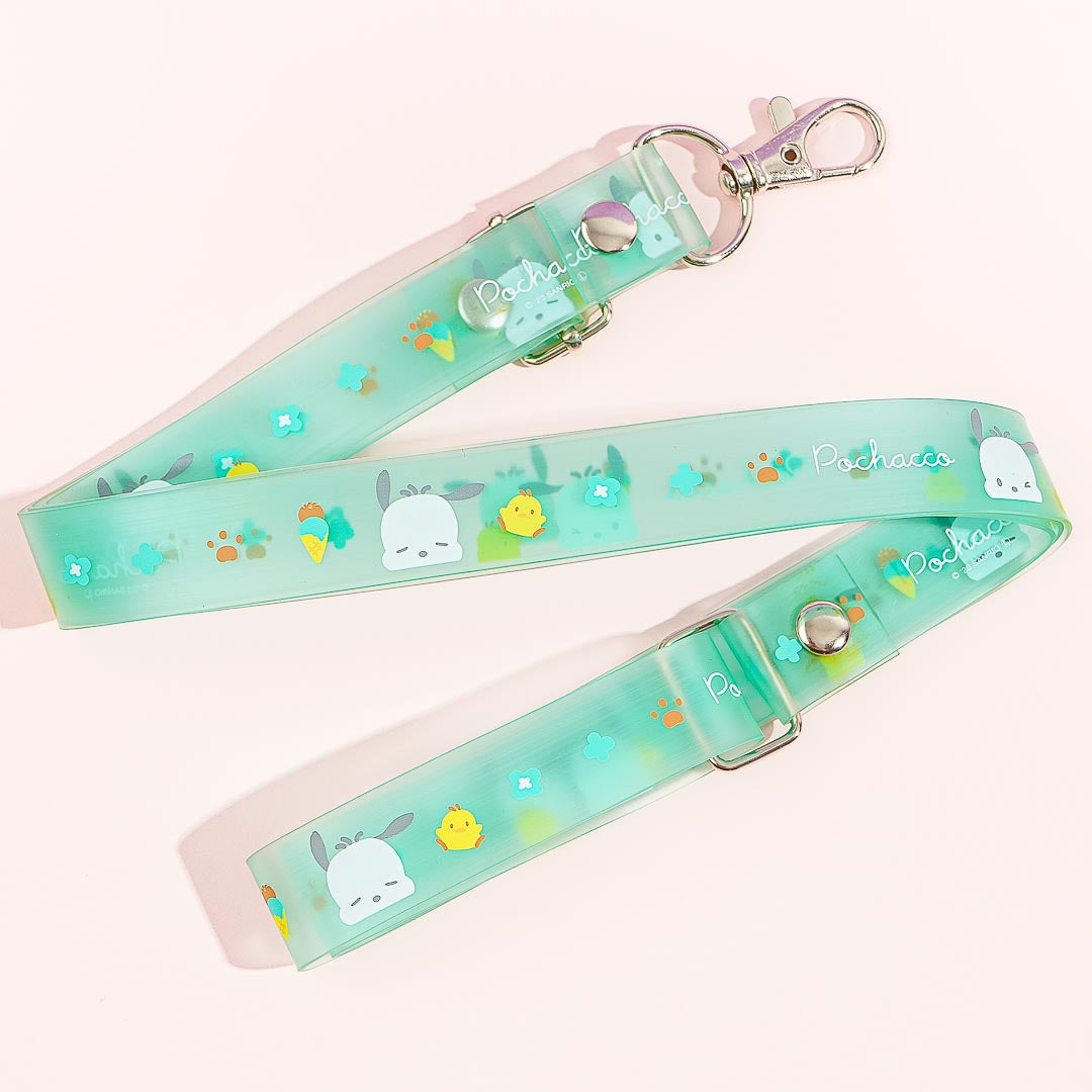 Have fun wearing your school or work ID with this kawaii green lanyard! It’s decorated with cute illustrations of Pochacco, flowers, leaves, and pawprints. The lanyard is adjustable and can also be used as a bag strap.