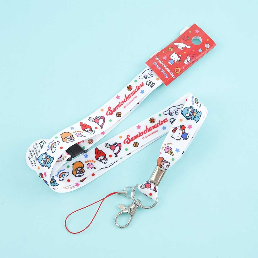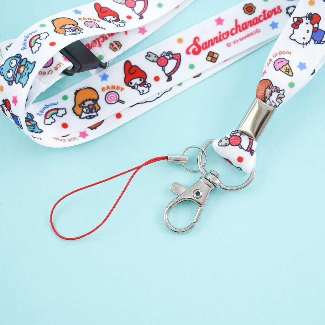 • A kawaii lanyard decorated with prints of Sanrio characters and yummy goodies