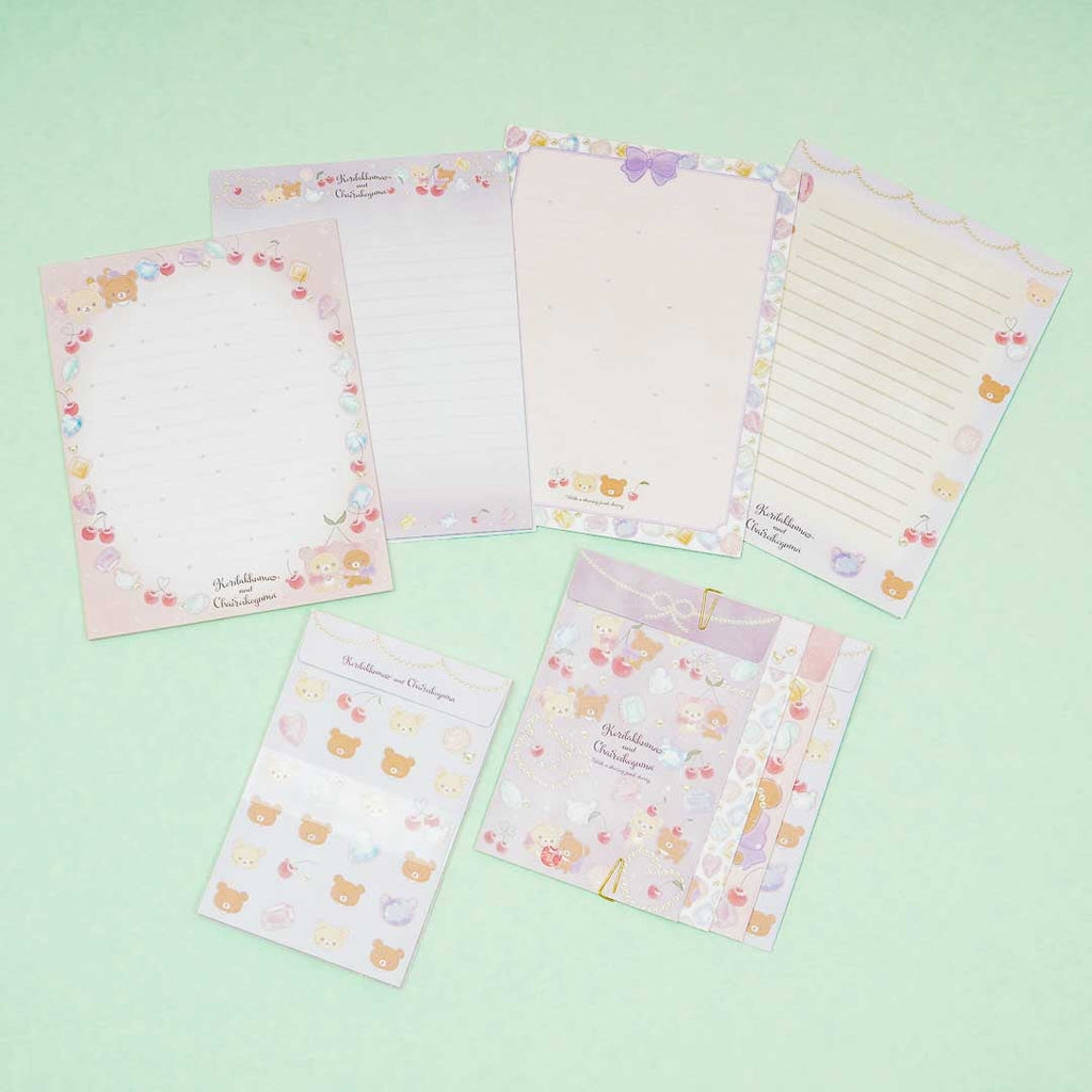 Send heartfelt handwritten letters to your friends using this cute stationery set. It features prints of Korilakkuma and Chairoikoguma with cherries and jewels. This kawaii letter set includes four types of letter paper envelopes.
