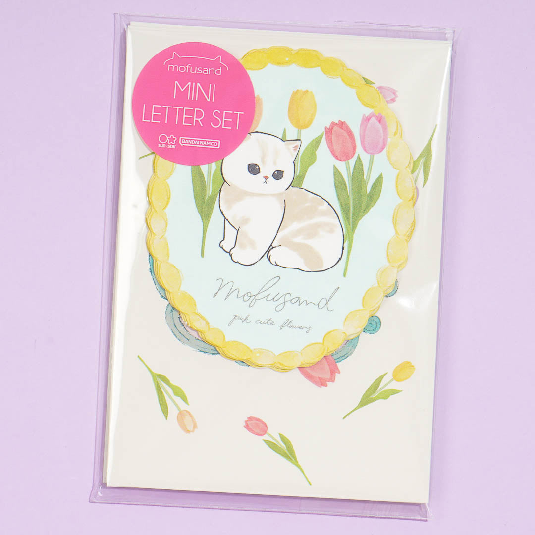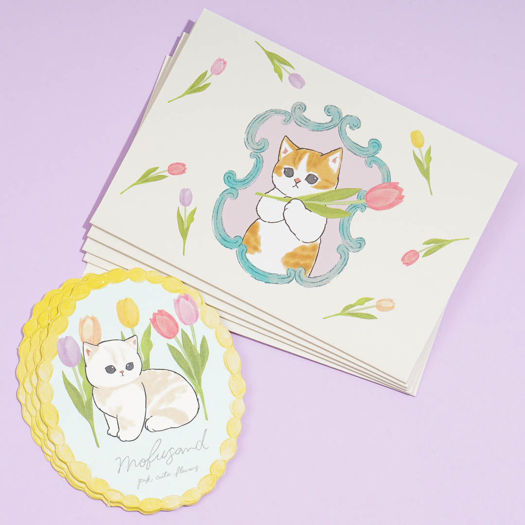 Add this kawaii letter set to your stationery collection! It features illustrations of Mofusand cats with pastel-colored tulips. The mini die-cut oval letter sheet gives this set a cute and elegant look!