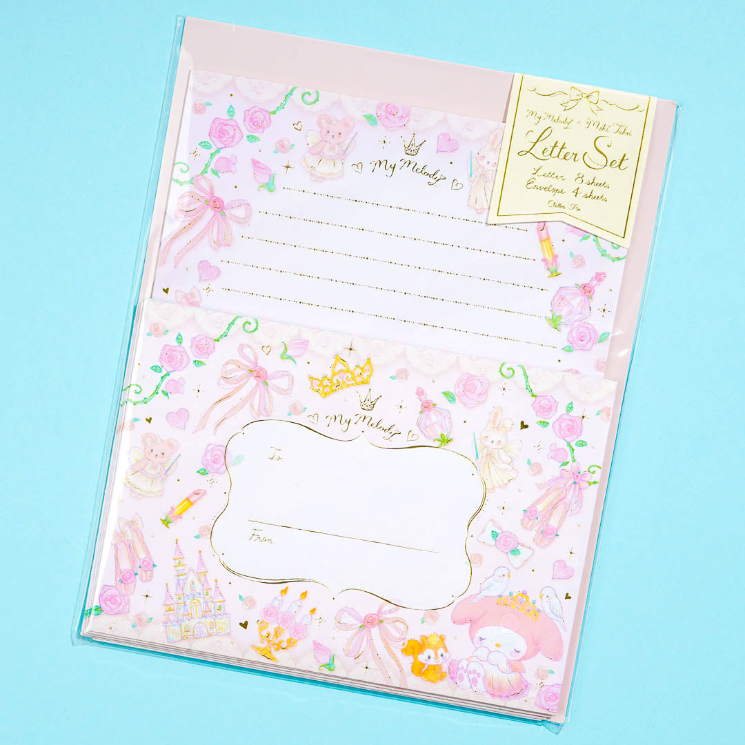 Create handwritten letters by using this kawaii set! It includes sheets and envelopes with matching pastel prints of My Melody dreaming about tiaras, roses, castles, and more magical princess things!
