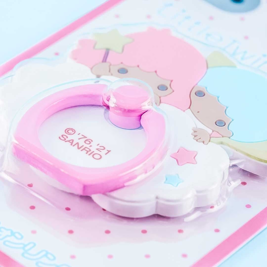 This kawaii die-cut mobile phone ring features the Little Twin Stars on a star-filled cloud! Use this multi-ring as a holder or as a phone stand. It has an adjustable colored metal ring, a base made of durable plastic, and an adhesive at the back.