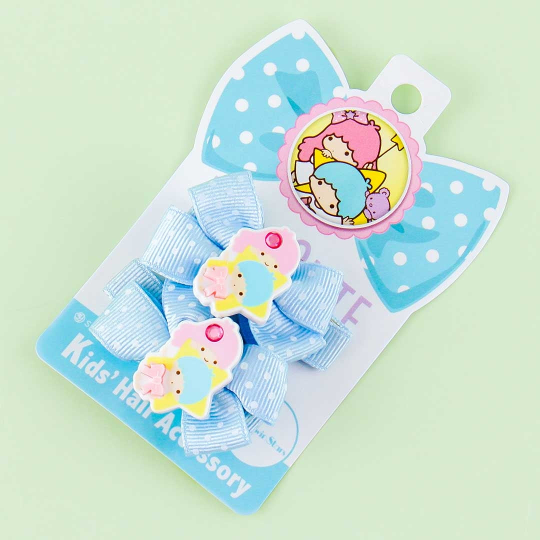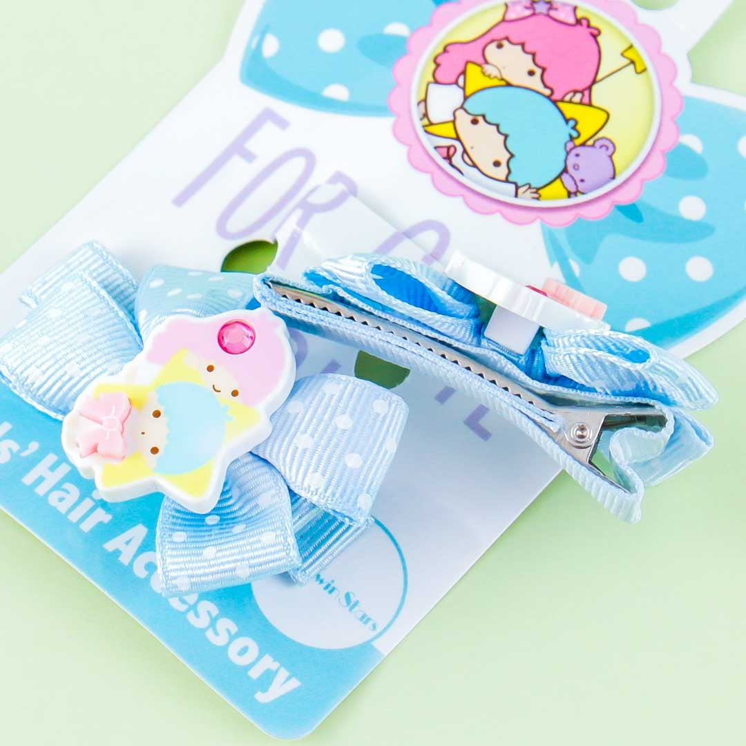 A kawaii pair of hair clips featuring the Little Twin Stars, polka dot ribbons, and gemstones
