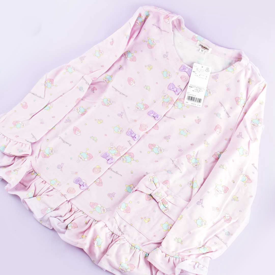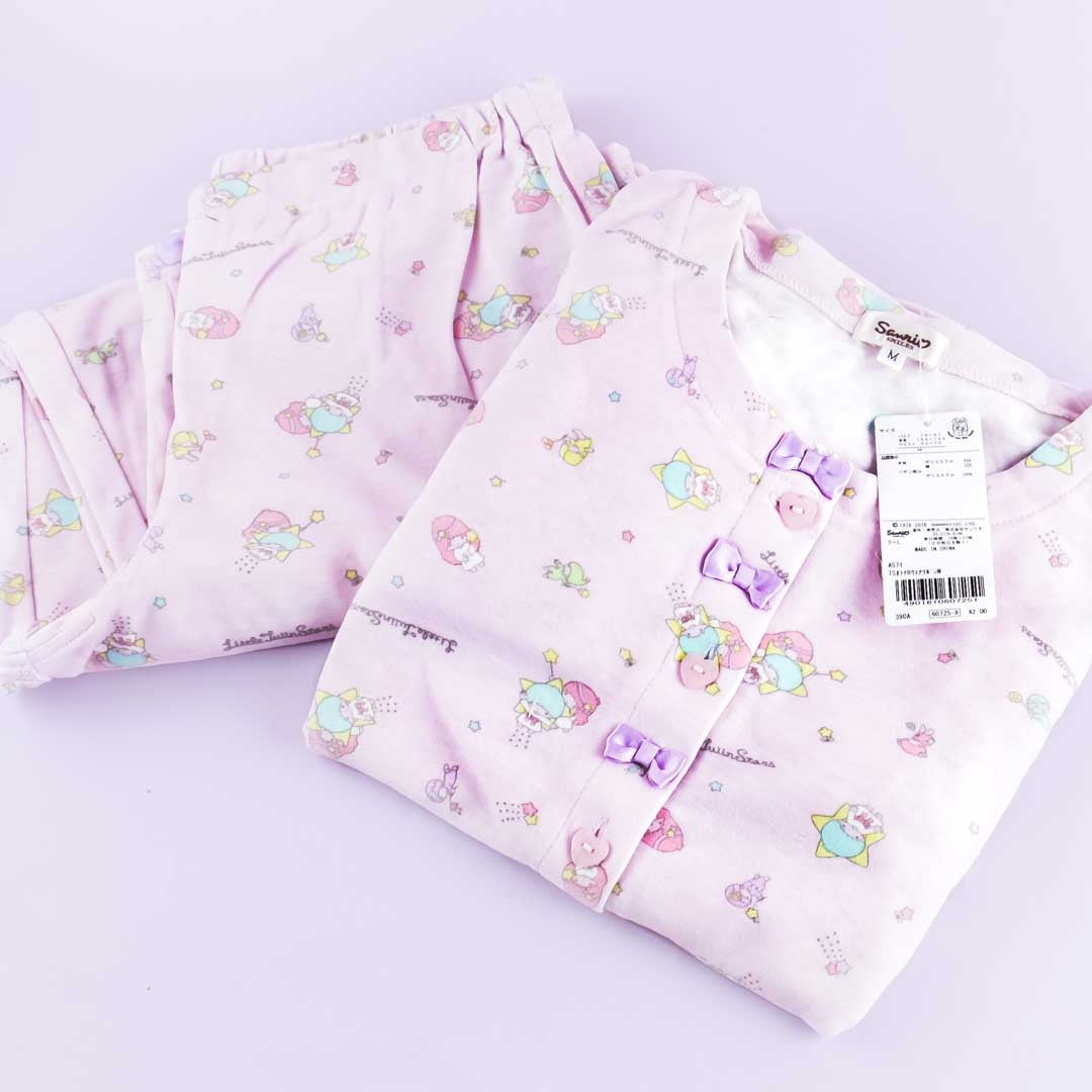 Go to bed wearing this super kawaii pajama set covered in prints of Kiki and Lala playing! This soft set of cotton and polyester pajamas fits a medium-sized adult woman. Undo the buttons so that you can put its cute shirt on!