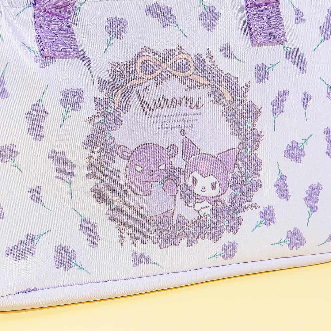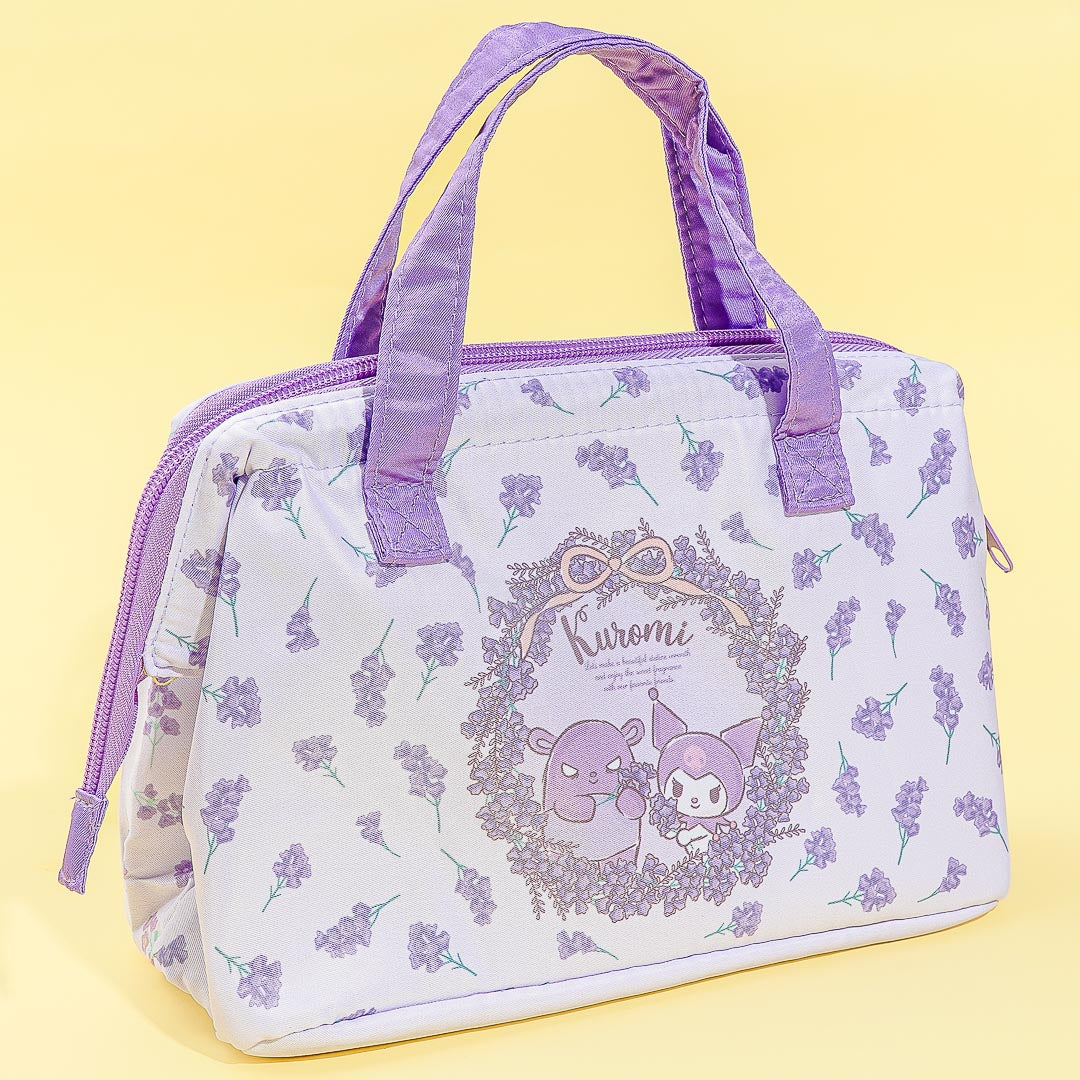 This super cute lunch tote has a unique wide-mouth metal clasp opening so you can easily place your snacks and bento box inside! It also features kawaii illustrations of Kuromi, Baku, and lots of lavender blooms! Take this lunch bag with you to your next picnic!
