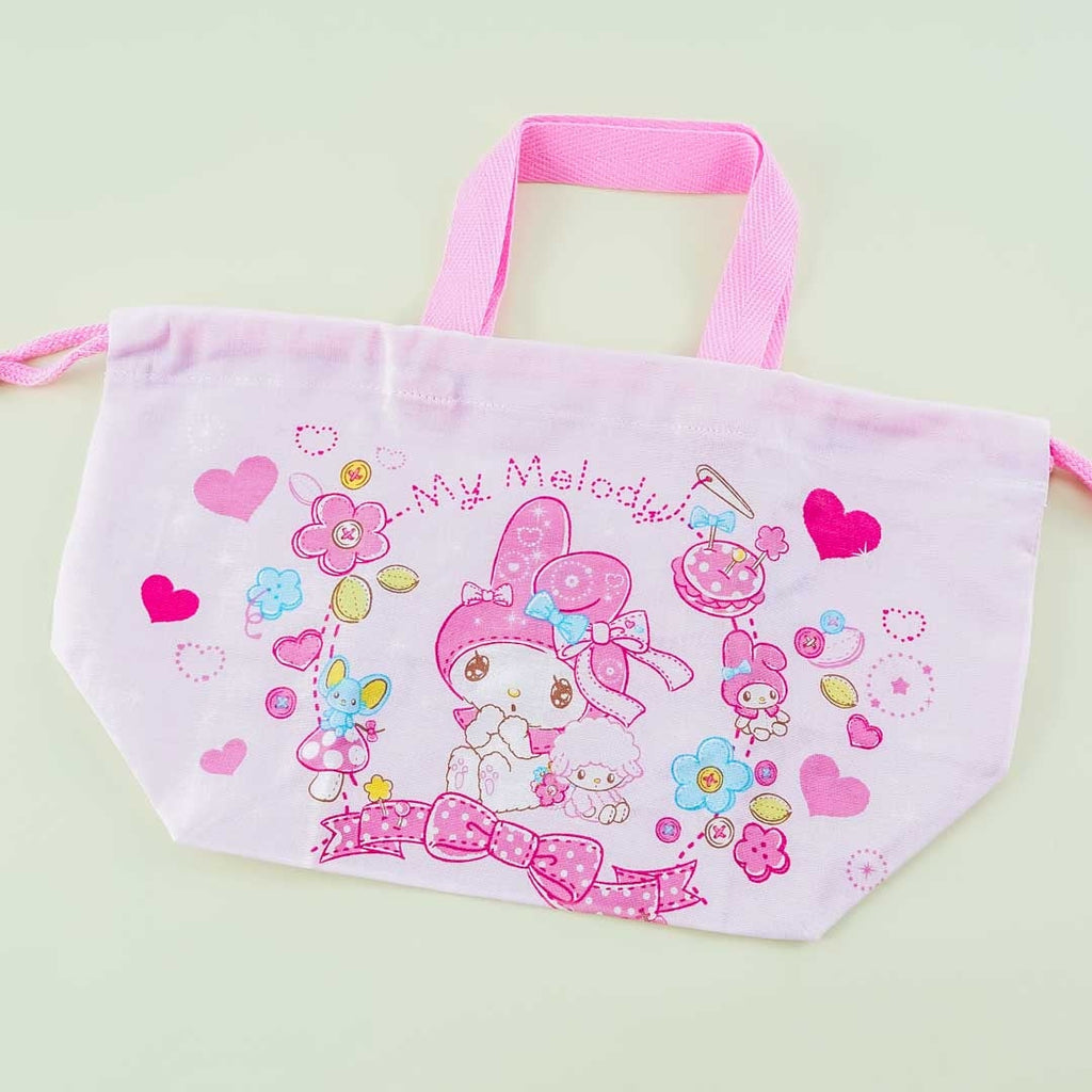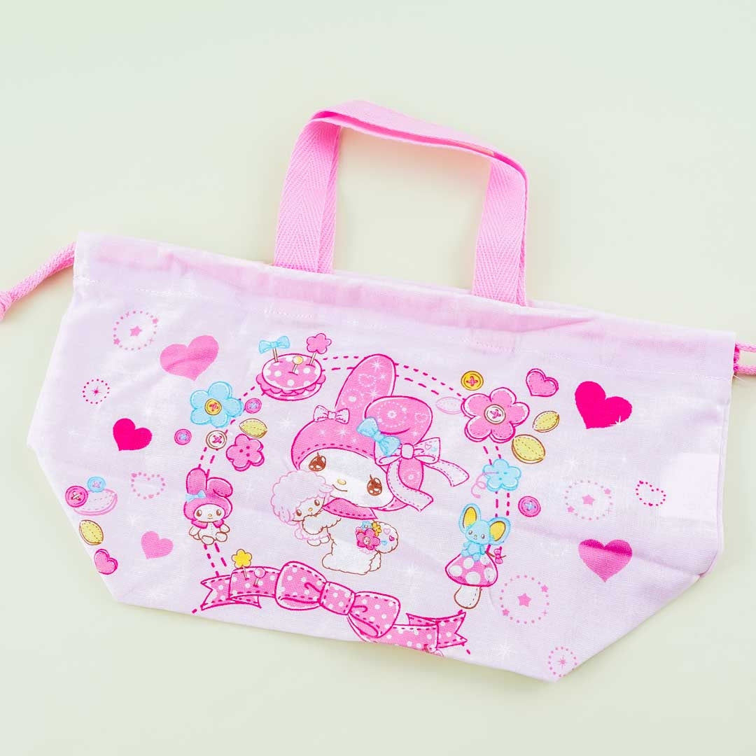 A cute drawstring lunch bag featuring a bright-eyed My Melody with flowers and hearts