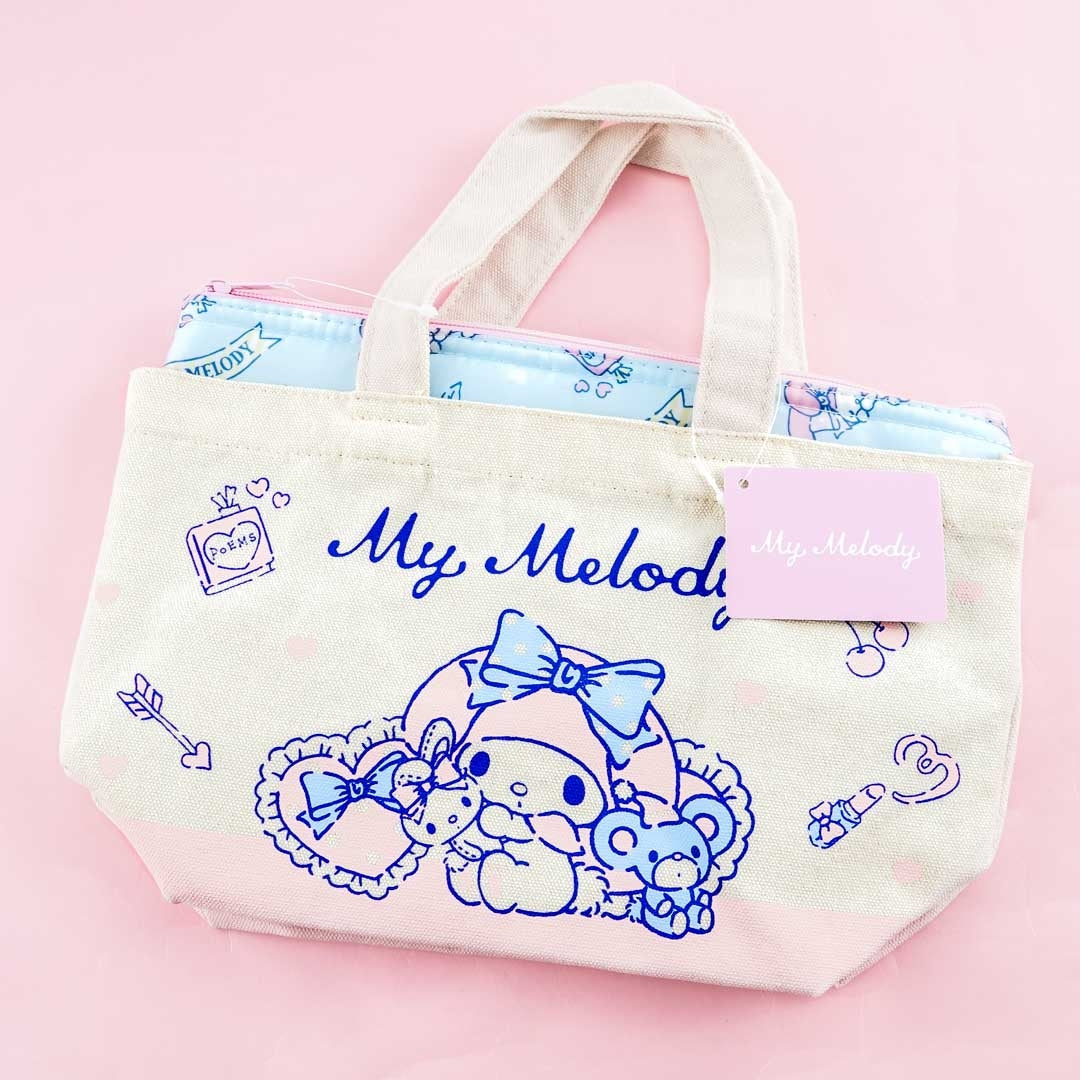 A super kawaii canvas tote bag and pouch set featuring prints of My Melody, hearts, arrows, and poetry books