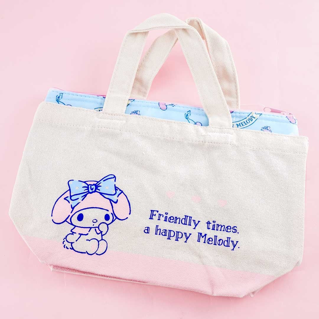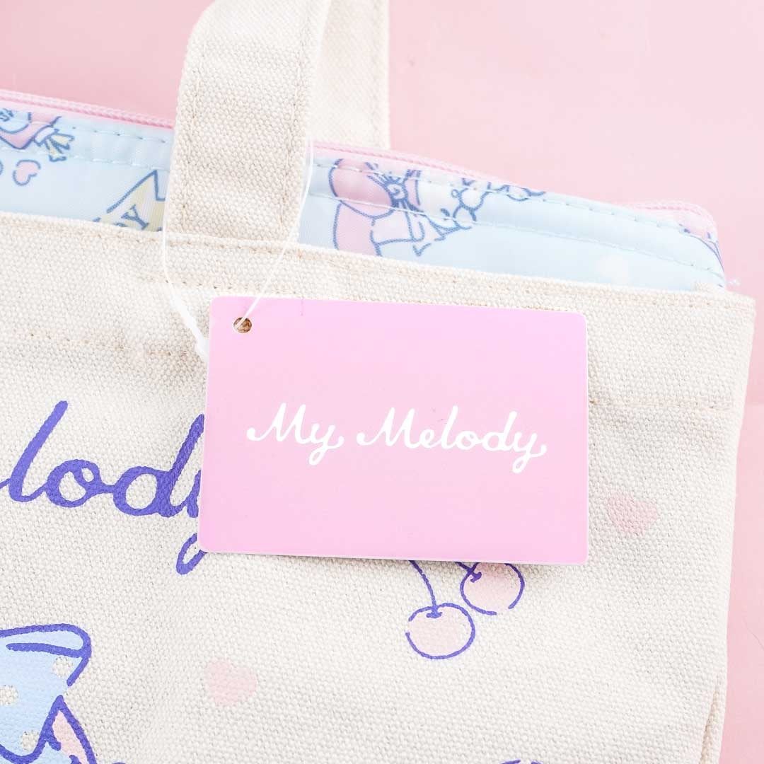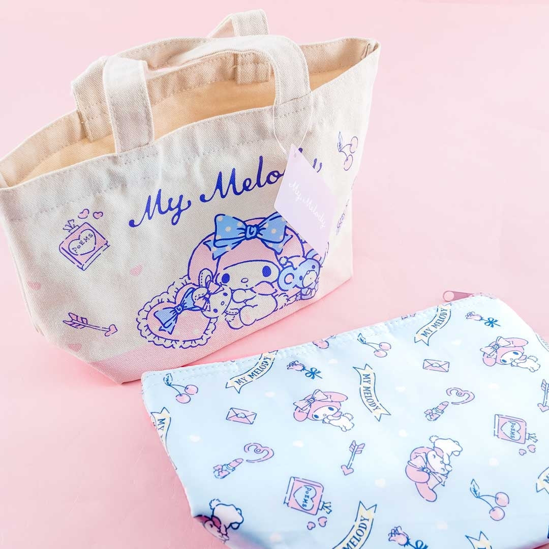 Bring your favorite snacks using this cute tote bag and pouch set! They're covered in prints of My Melody with hearts, arrows, and poetry books. You can keep treats fresh by placing them inside the zippered pouch - it has an aluminum inner lining. Remove the pouch from the canvas bag if you simply need a tote bag to take with you to the market.