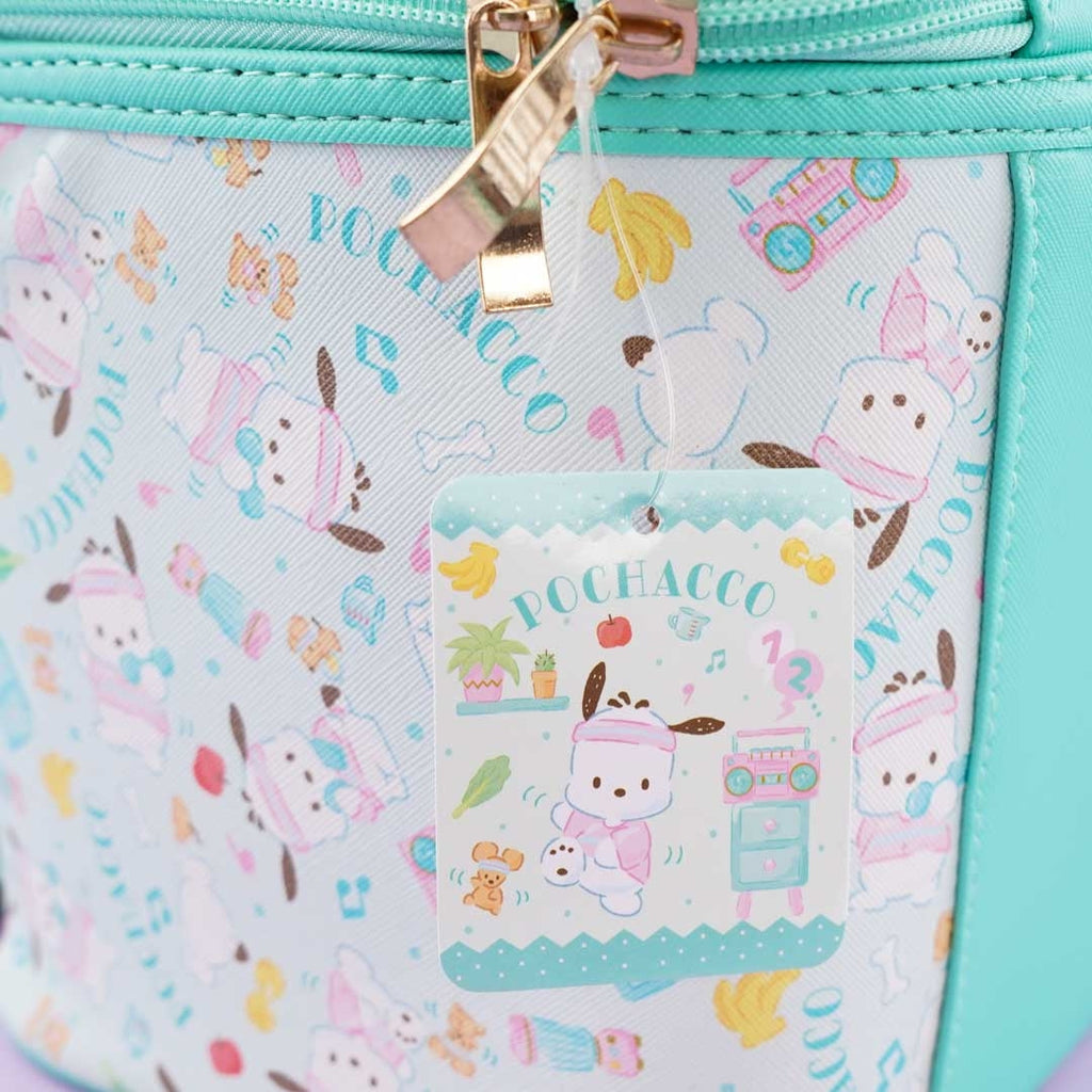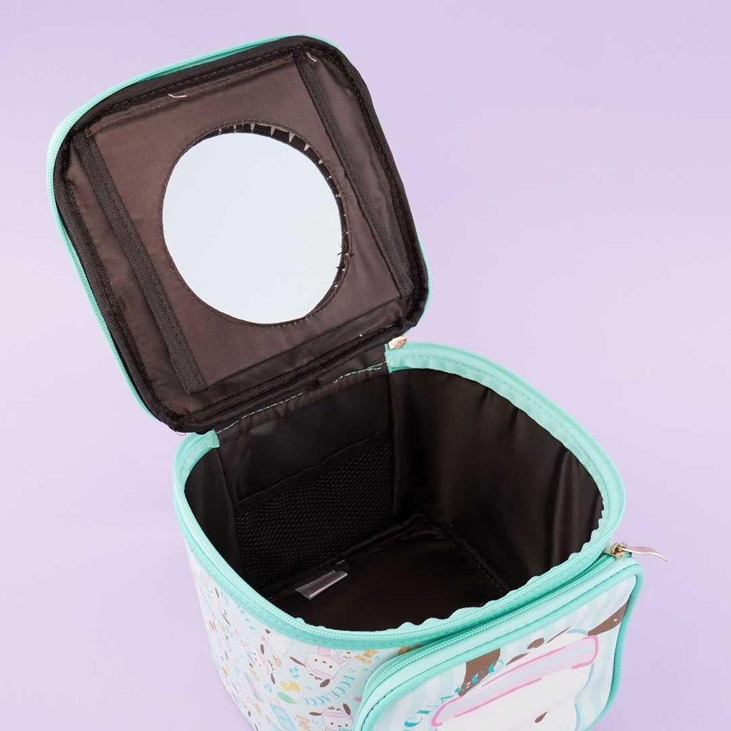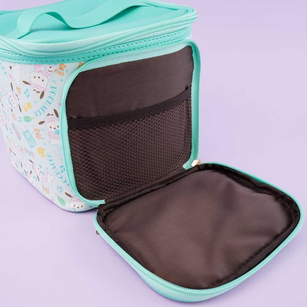 Store your cosmetics inside this kawaii cube-shaped vanity pouch illustrated with Pochacco working out! It has a zipper closure, multiple mesh pockets, and an inner mirror.