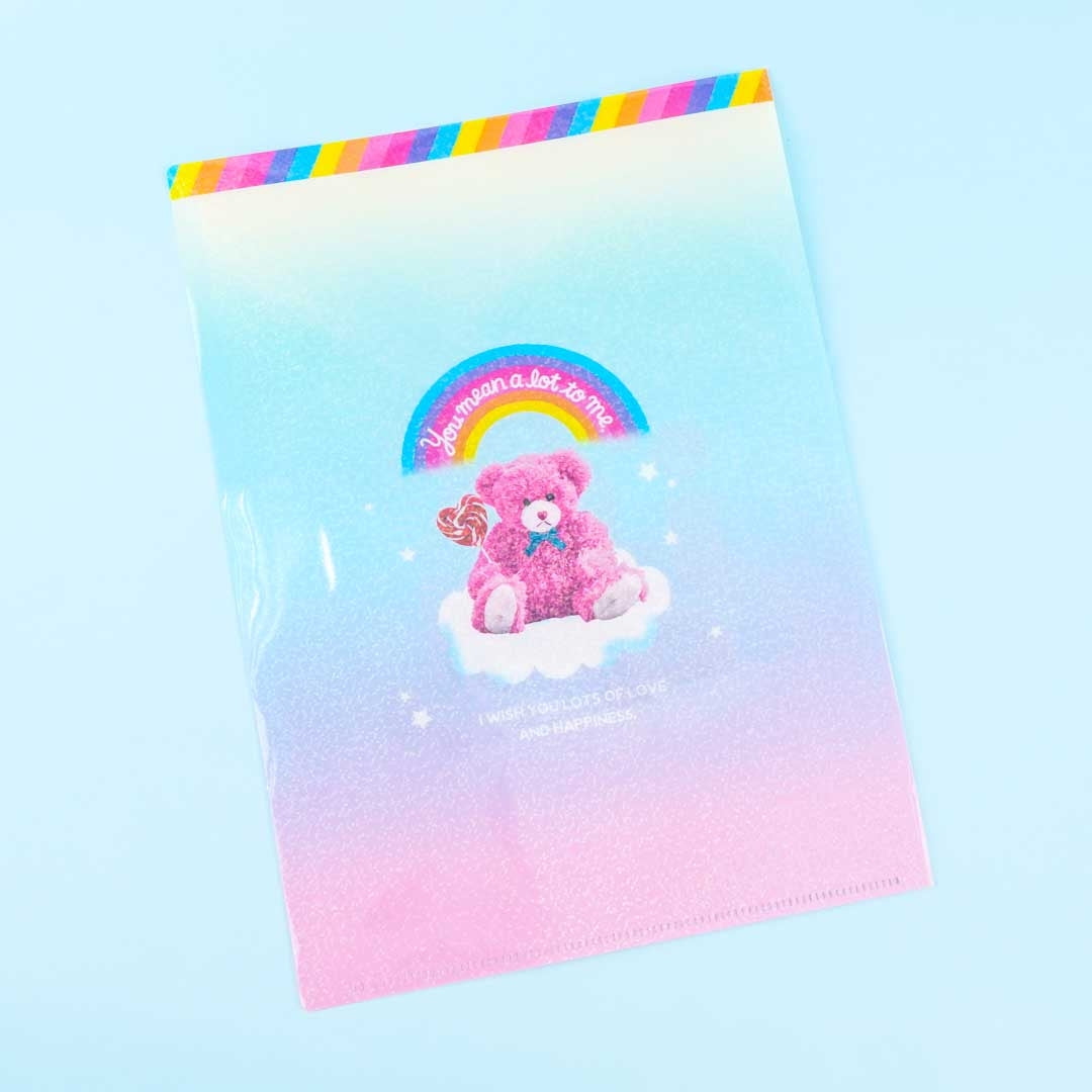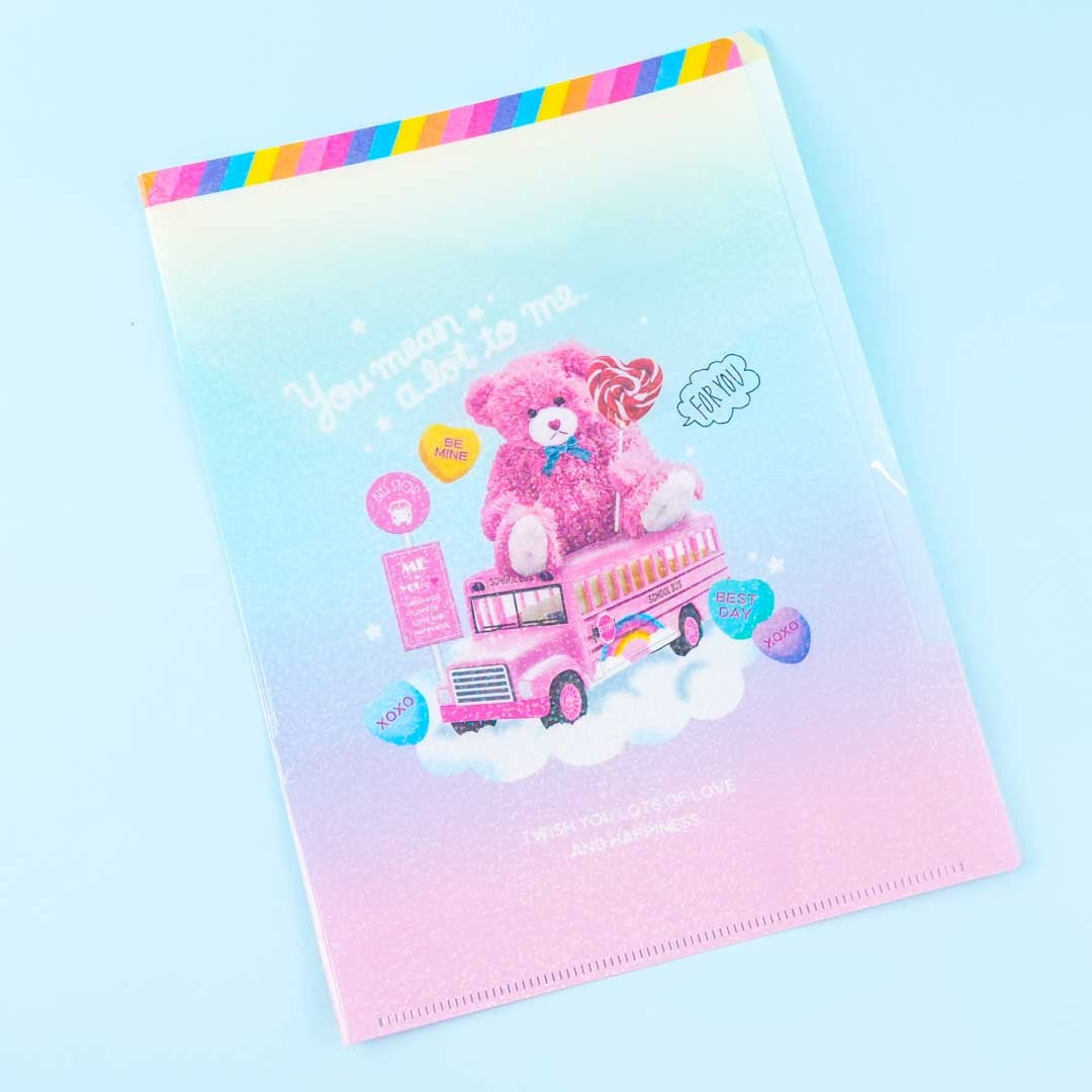 A cute A4 plastic folder illustrated with candy, a bear, clouds, and other things