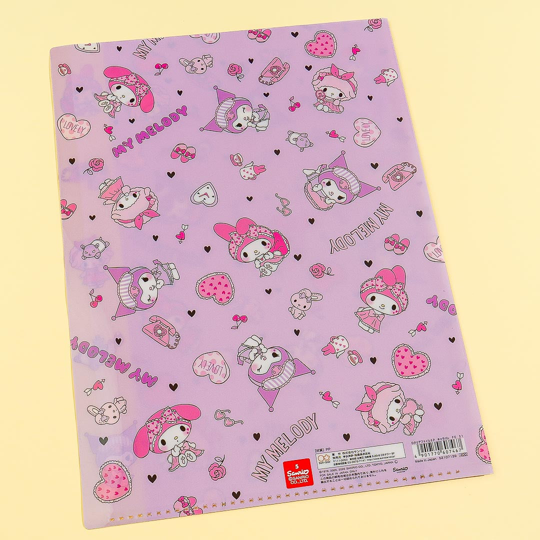 This cute A4-sized index folder is filled with colorful prints of hearts and My Melody and Kuromi having a fun sleepover! Store your school or work documents inside this super kawaii folder that has five slots.