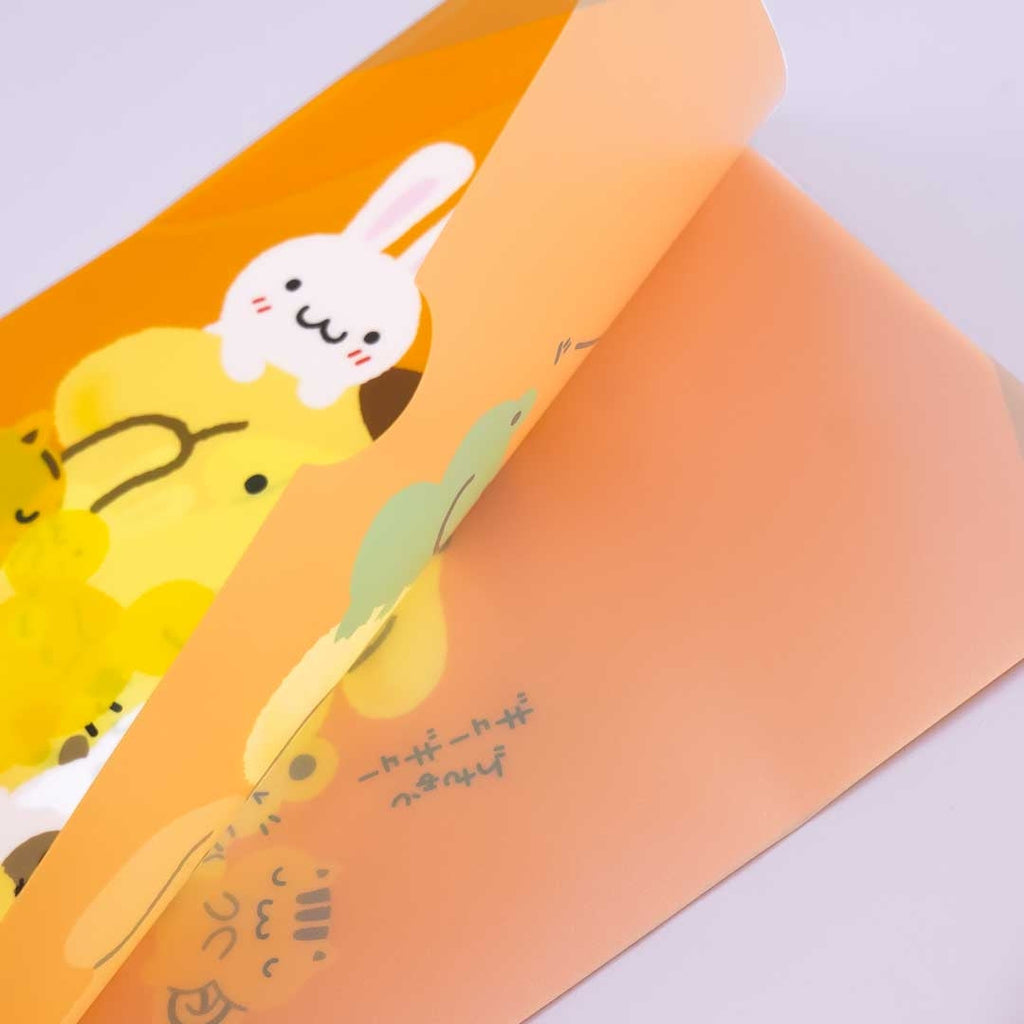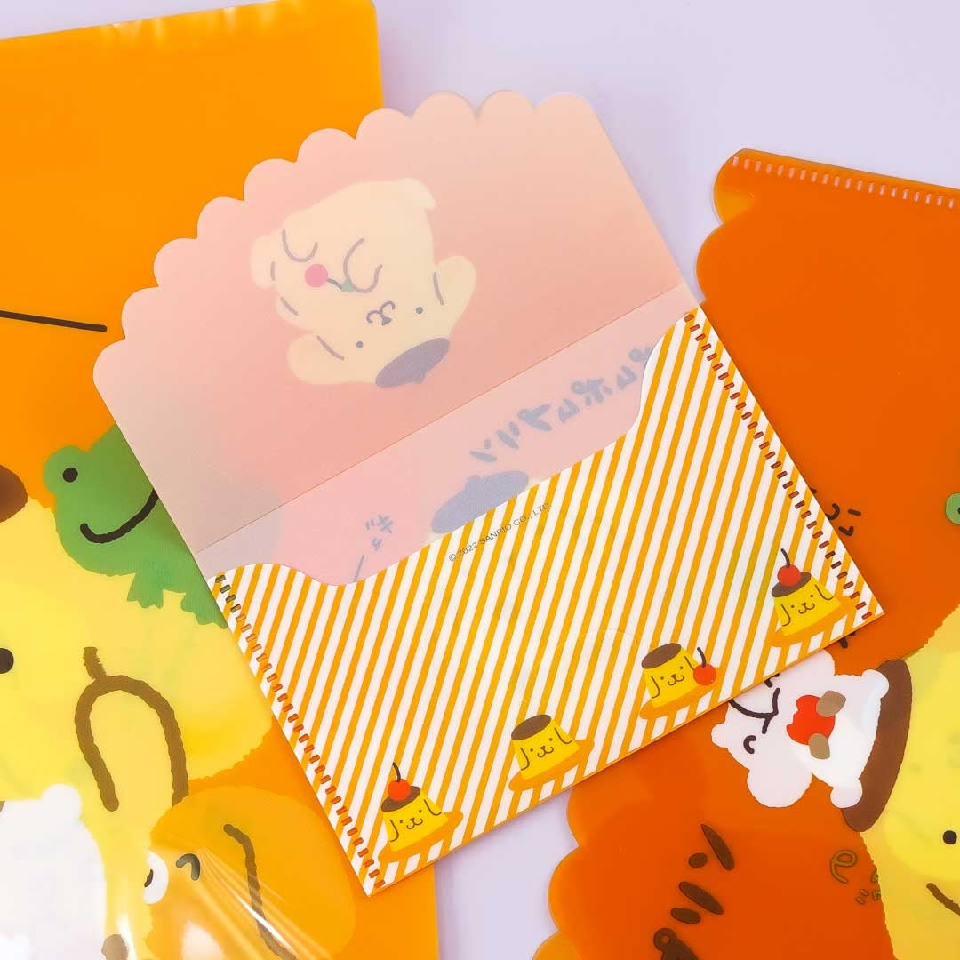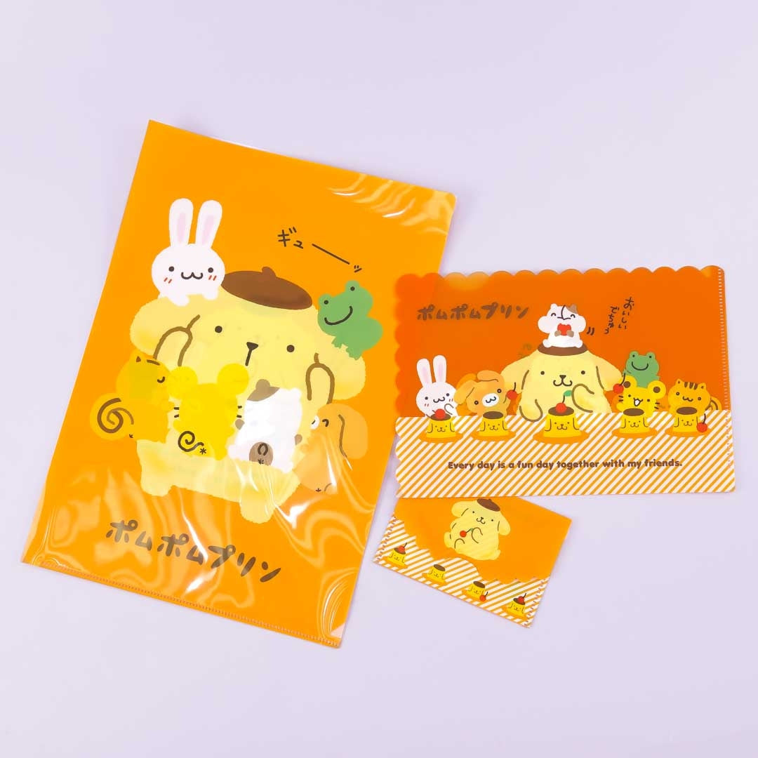 A kawaii clear file set featuring illustrations of Pompompurin with Team Pudding