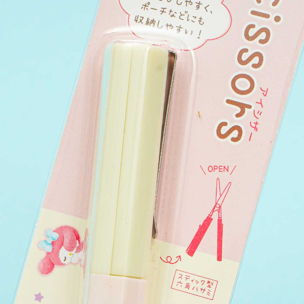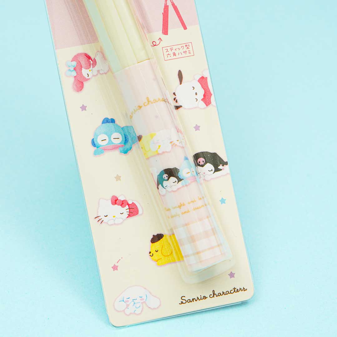 This pair of cute stick scissors illustrated with Sanrio characters sleeping is the perfect addition to your stationery collection. It features a compact design with a cap for safety and a holder clip.