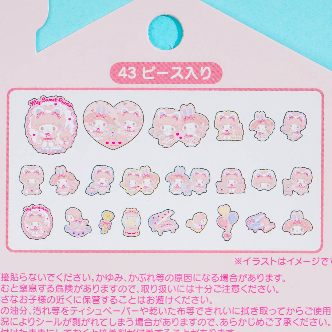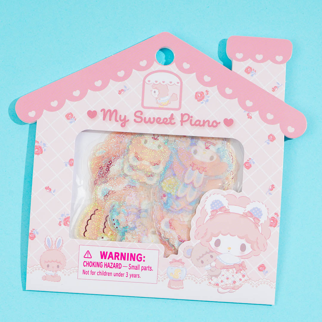 This sticker pack features glittery die-cut prints of My Sweet Piano, her friend My Melody, and her favorite childhood toys. Use it to add a touch of cuteness to your notebooks, planners, and other personal items!