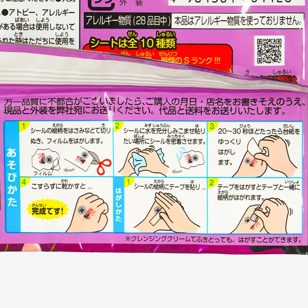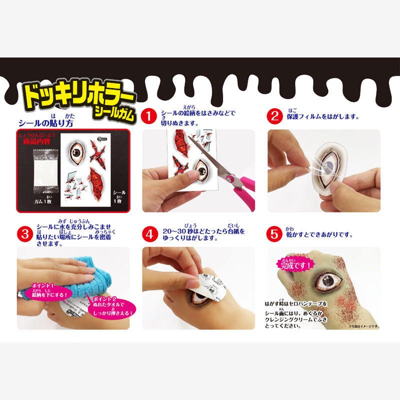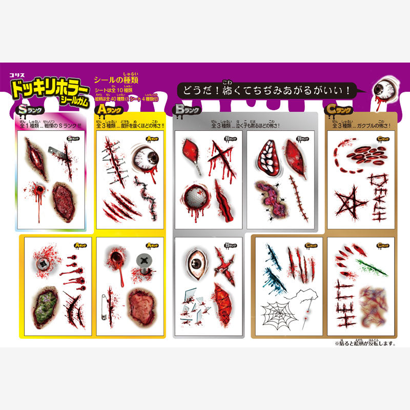 Get into the Halloween spirit with these creepy temporary tattoo stickers and a piece of soda-flavored gum! This pack comes with a horror-themed tattoo sheet featuring designs like scars, stitches, or spooky eyes that look super realistic when applied with just water.