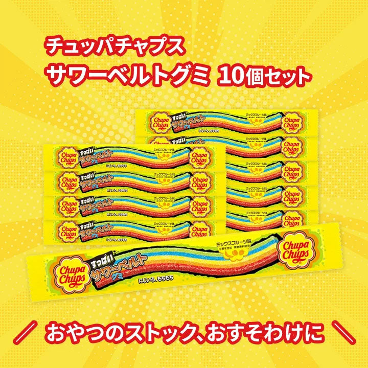 Enjoy your favorite Chupa Chups lollipop as gummies! This gummy candy strip is rainbow-colored and has a sweet and sour mixed fruit flavor. It's coated with sour powder, so be ready to pucker your lips on the first bite!