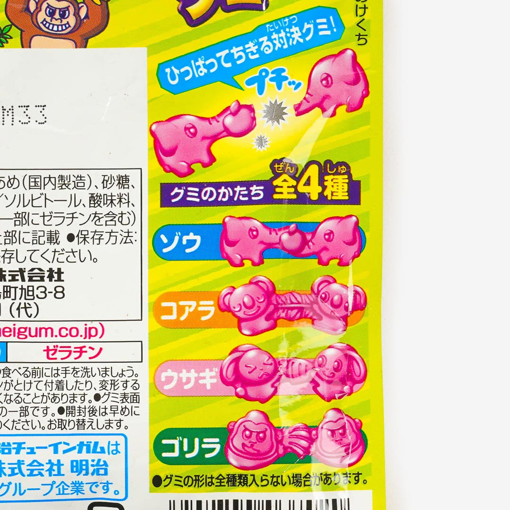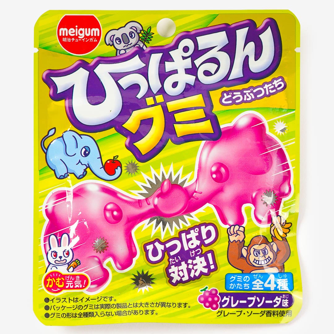 Challenge your friends to a gummy tug-of-war! These stretchy animal-shaped gummies can be played with by pulling or tearing. With a sweet and fizzy grape soda flavor, each pack comes with one of four different animal designs.