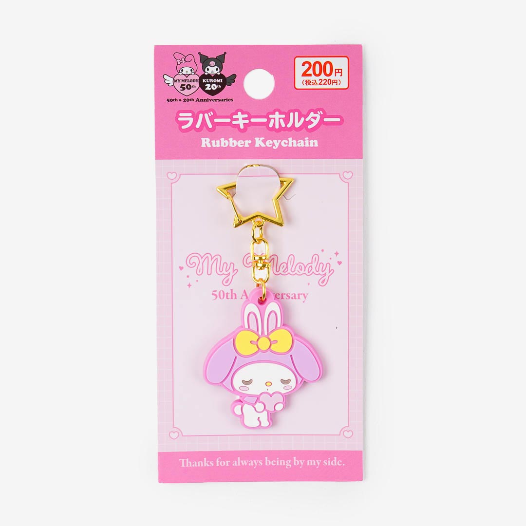 Celebrate 50 years of kawaii with My Melody with this super cute rubber keychain! It features My Melody holding a heart. You can easily attach this to your keys using the star-shaped metal hook.