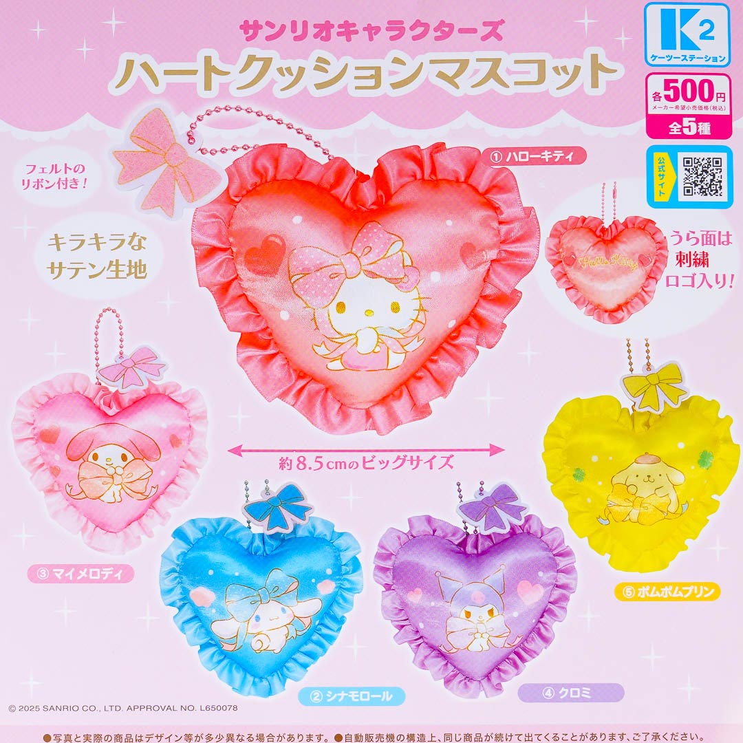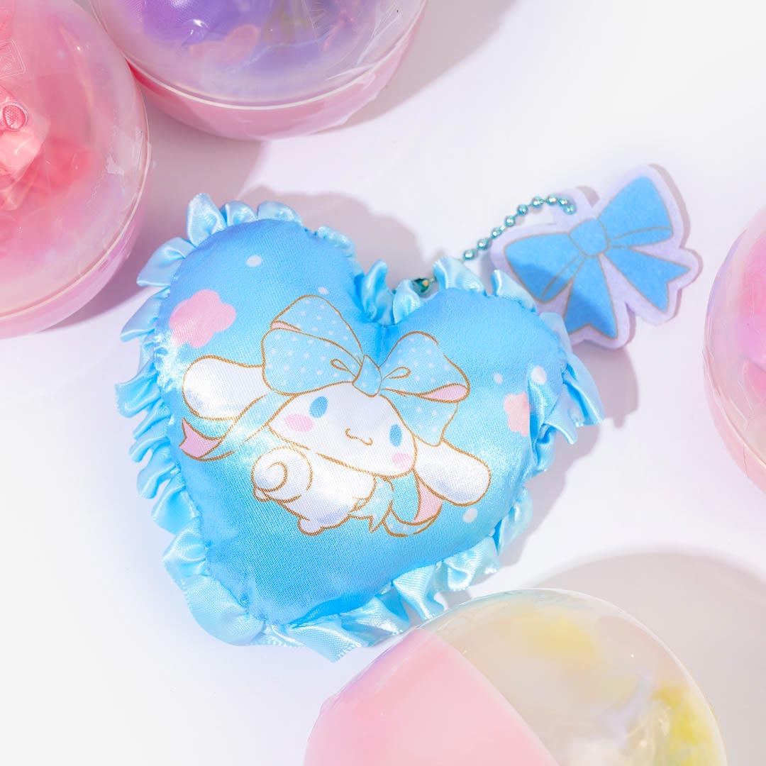 Open this capsule toy and you'll get a surprise heart-shaped cushion charm! It features super cute illustrations of Sanrio Characters with huge ribbons. Attach it to your bag or purse using the removable ball chain.