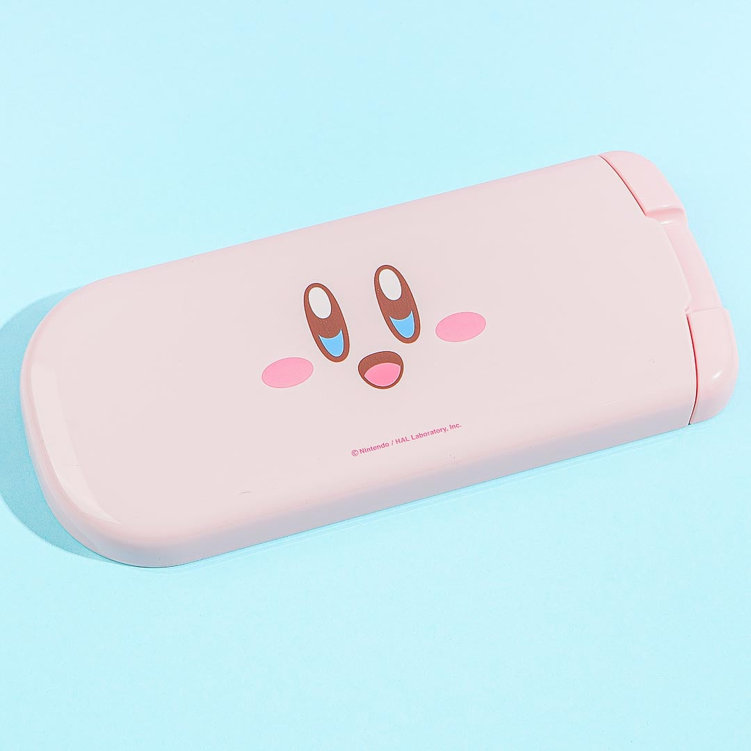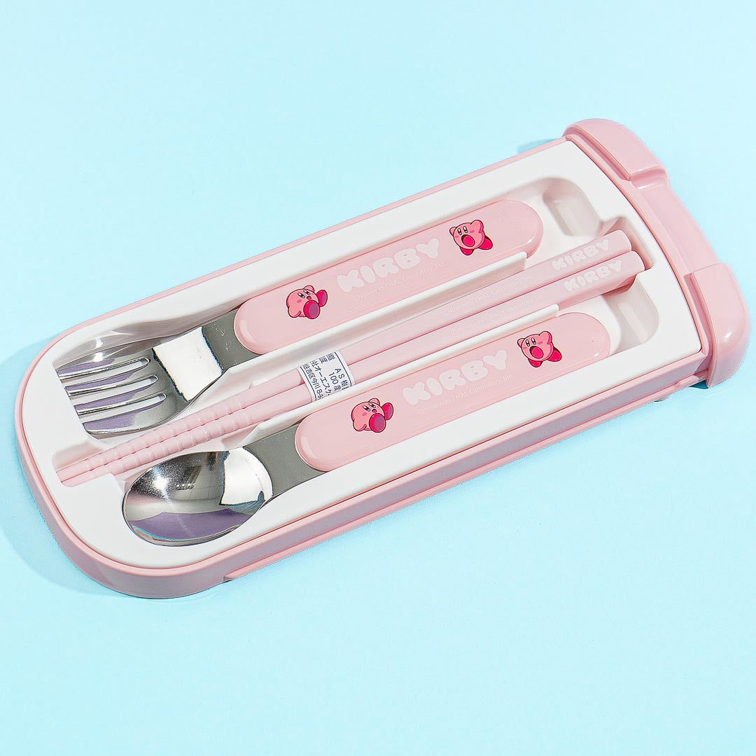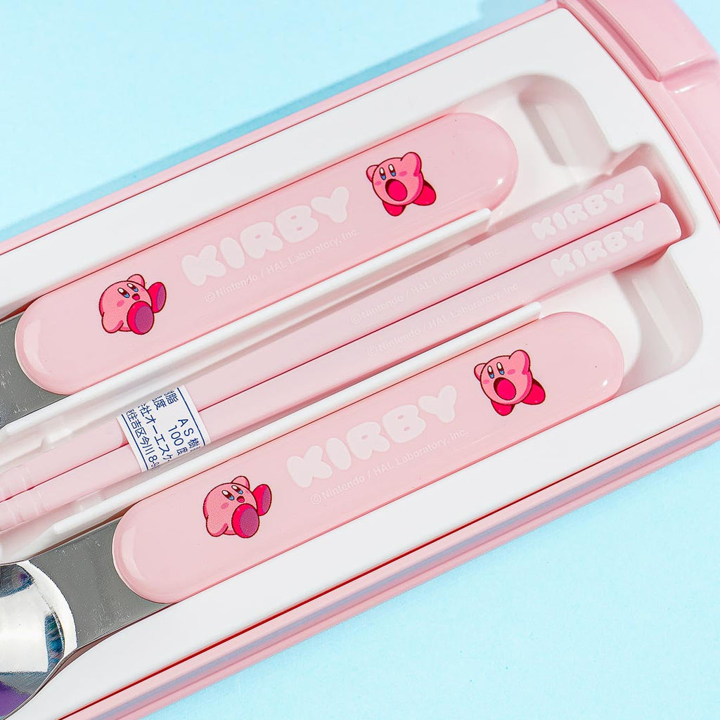Take this super cute utensil set with your bento box for lunch. It showcases a print of Kirby's happy face. This utensil set includes a pair of chopsticks, a spoon, a fork, and a carrying case. You can slide the lid of the case to open it!